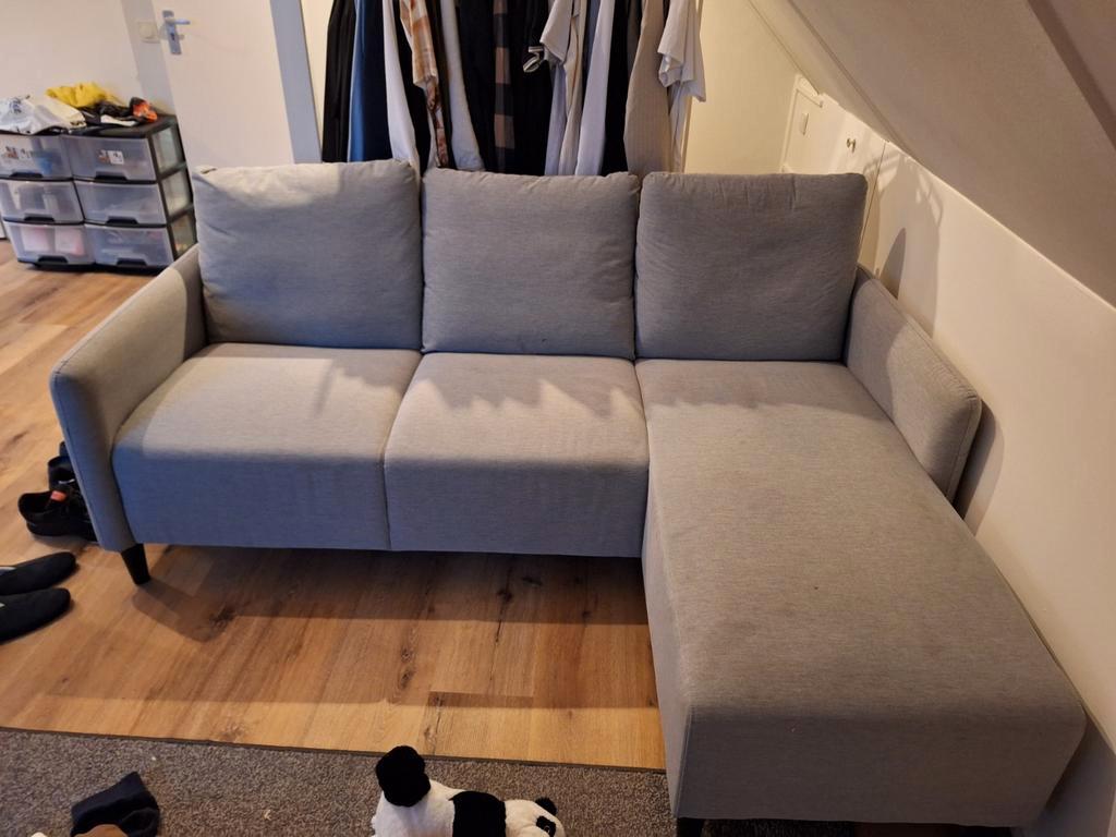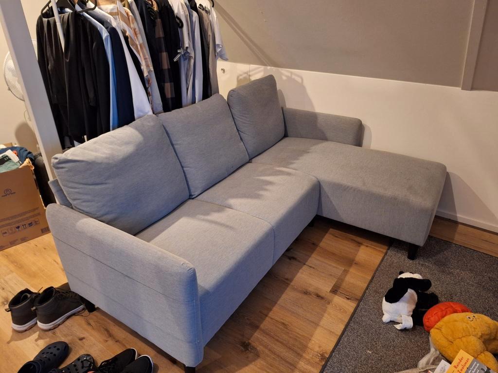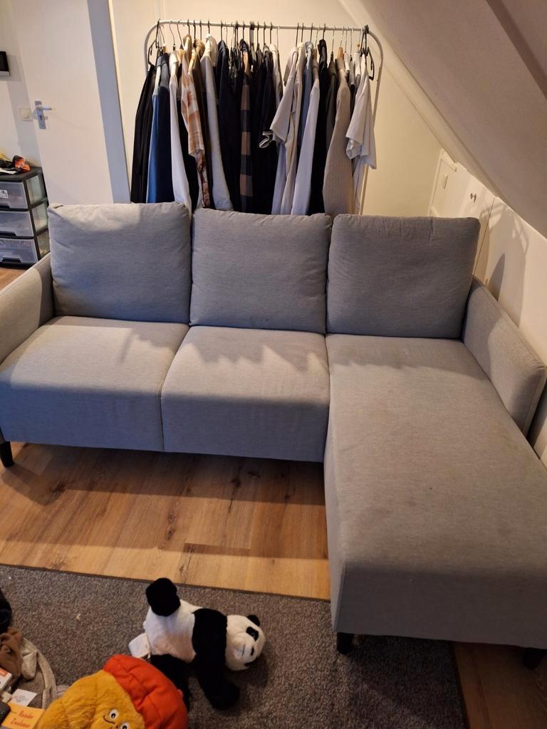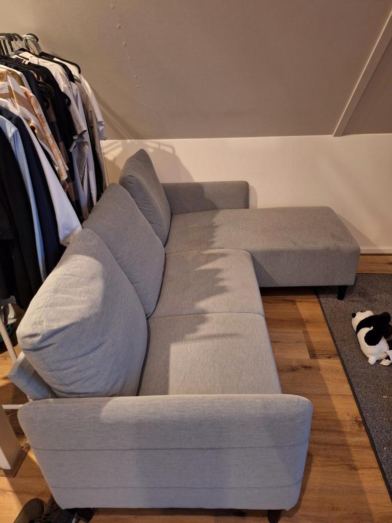 Ikea blauwgrijze angersby 3-zitsbank met chaise longue. Er zitten gebruikssporen op, vlekken, op de chaise longue. Maar het is een