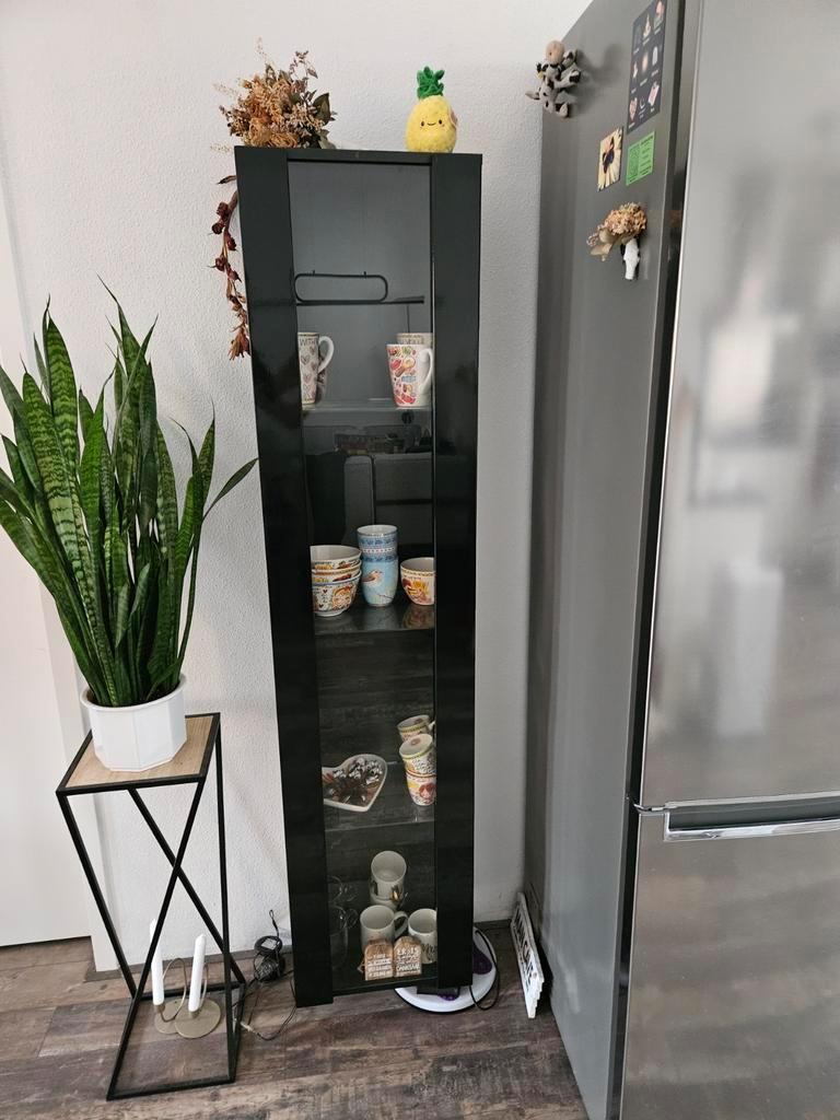 Nette hangkast met glazen platen aan de binnenkant. Kast is ook voorzien van verlichting maar de stekker is kapot dus werkt niet h