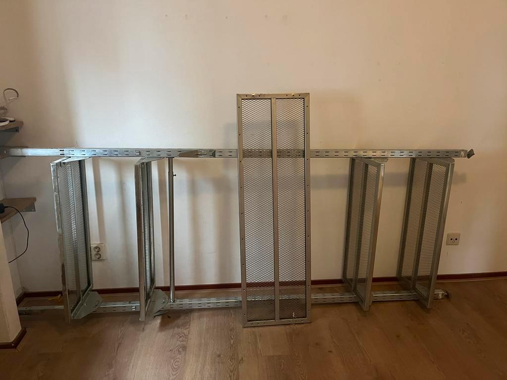 Een kleding kast met rekken en een stang, 1 rek is los die kan je er aan vast maken als je wilt. Hij is vast te maken aan plafond,