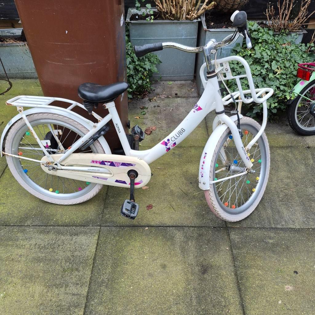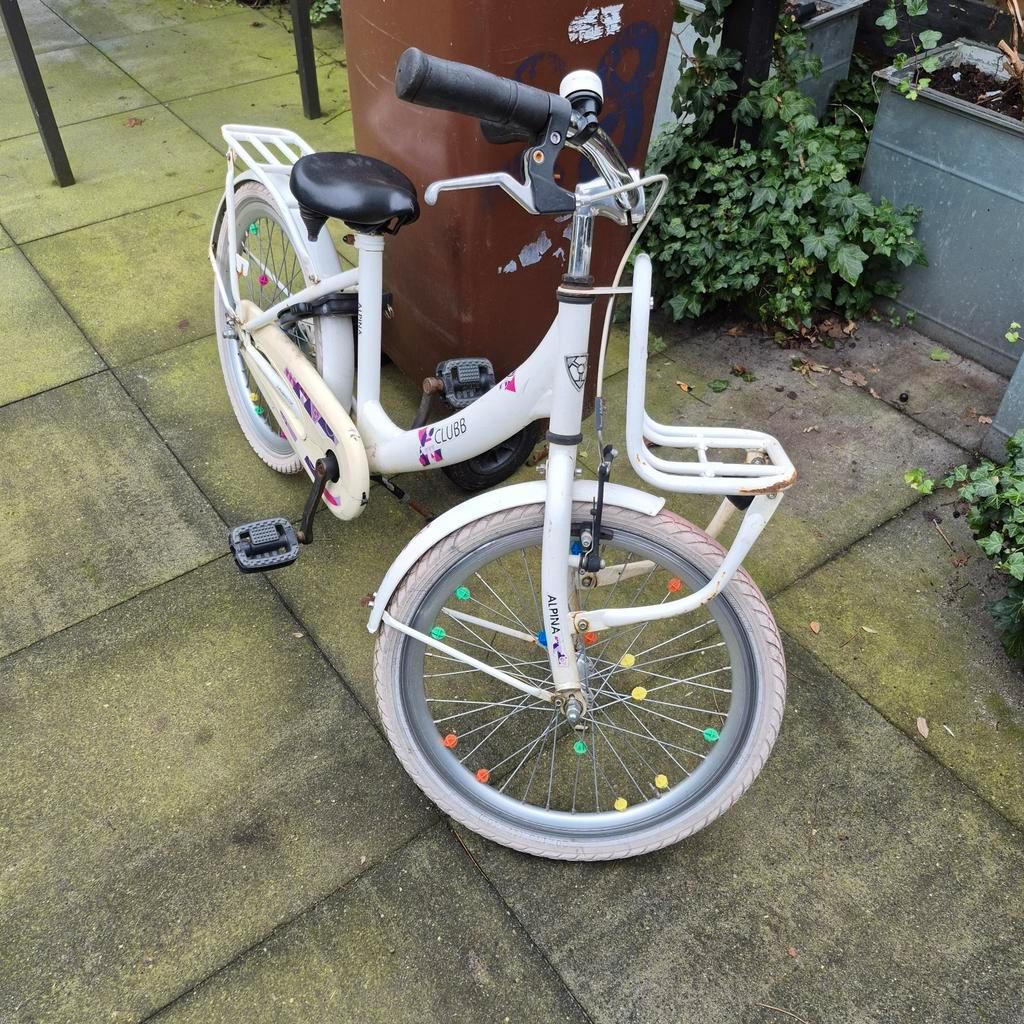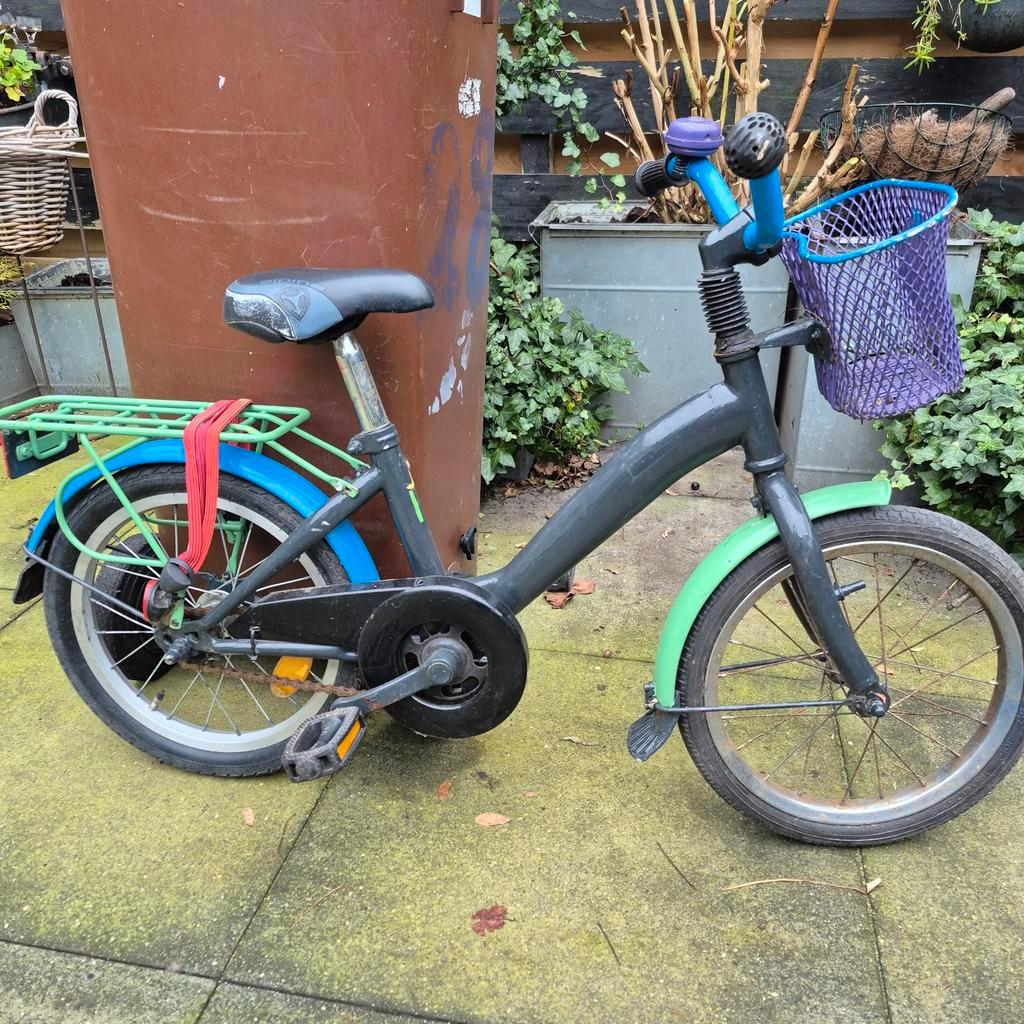 Diverse kinderfietsen te koop: een donkergrijze 16 inch fiets (gratis), een 16 inch fiets met slingers (45 euro) en een witte 20 i