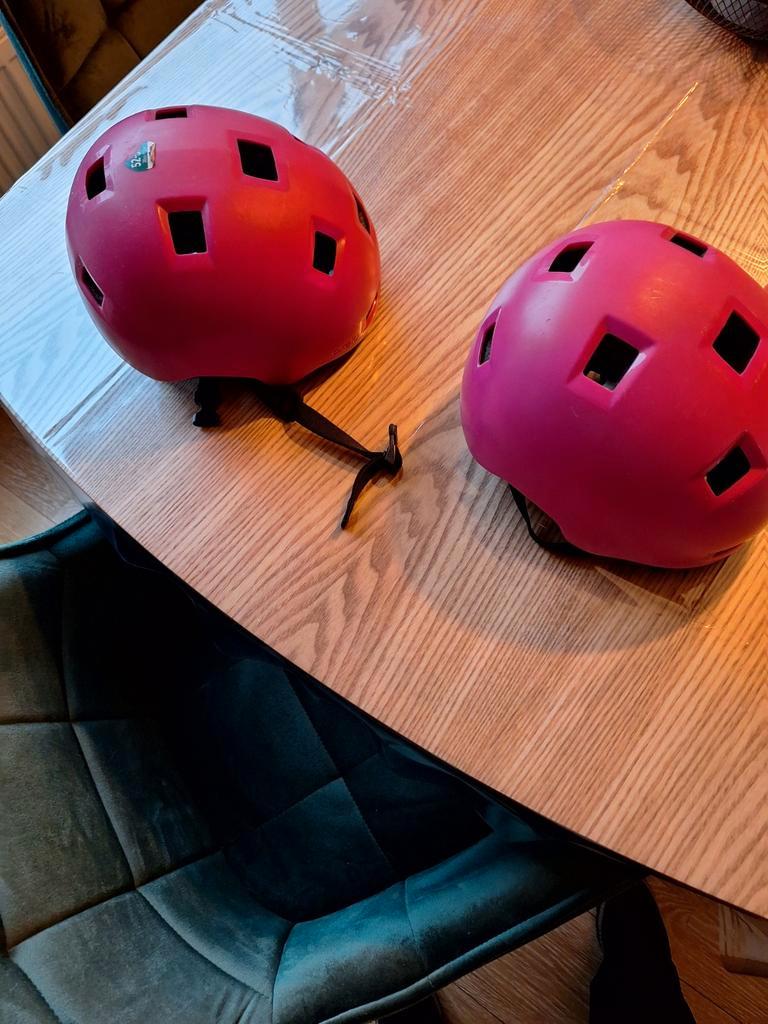 Set van twee fietshelmen of gebruiken tijdens het skeeleren in roze geschikt voor kinderen. In goede staat. Maat s