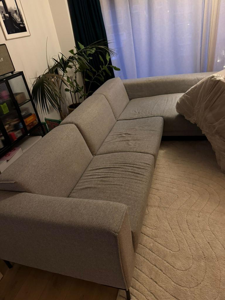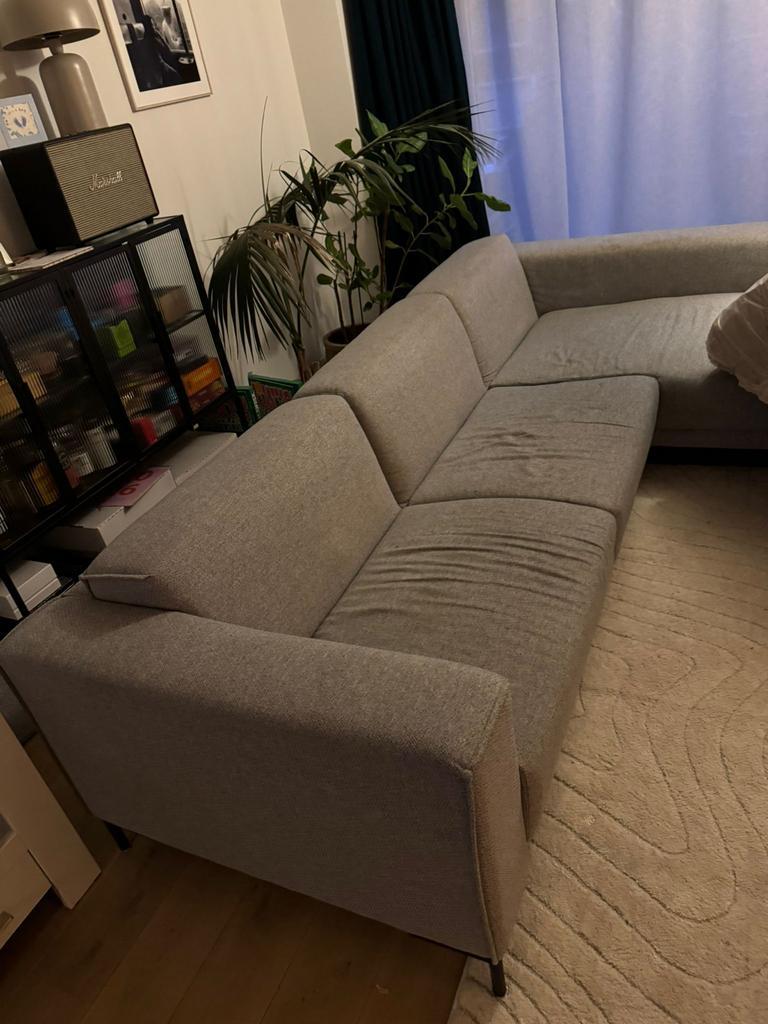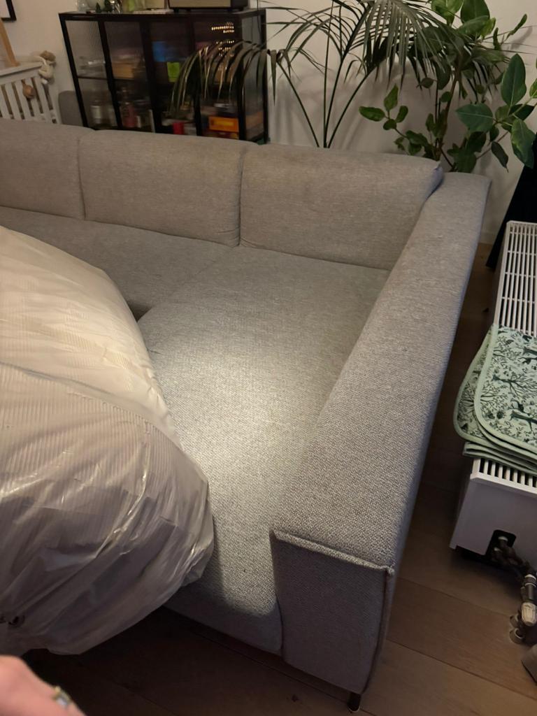 Comfortabele hoekbank met een ruim lounge gedeelte. De bank is goed gebruikt en biedt veel zitruimte. De bank is bekleed met een s