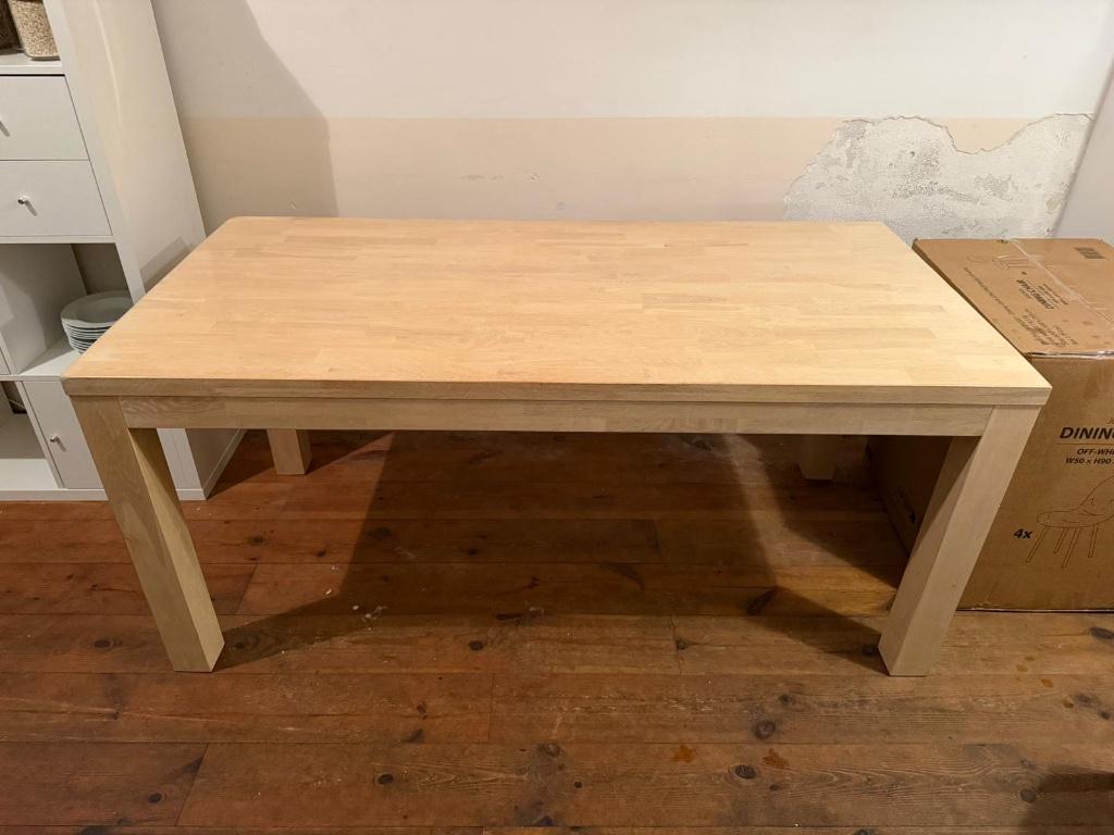 Gebruikte houten eettafel met enkele gebruikerssporen. Lengte: 160cm breedte: 81cm hoogte: 62,5 gratis af te halen! Wij halen hem