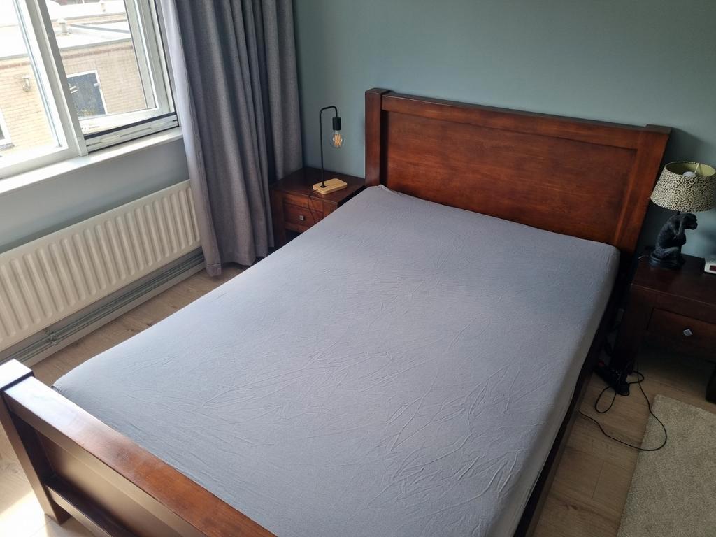 Mooie complete set bestaande uit een bed van 140x200 cm met een elektrisch verstelbare lattenbodem. Inclusief matras en twee bijpa