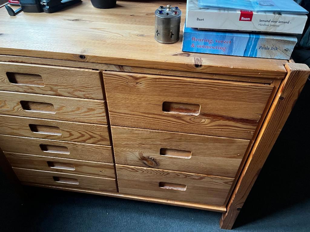 Handig ladenkastje van ikea, veel ruimte. 50 Diep, 84 breed en 71 cm hoog. Misschien even opschuren en opnieuw lakken. Gratis af t