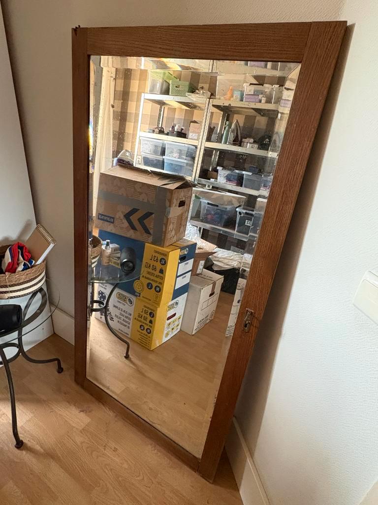Prachtige antieke spiegel in kastdeur, gemaakt van massief eikenhout. De spiegel heeft een mooie patina en is in goede staat gezie