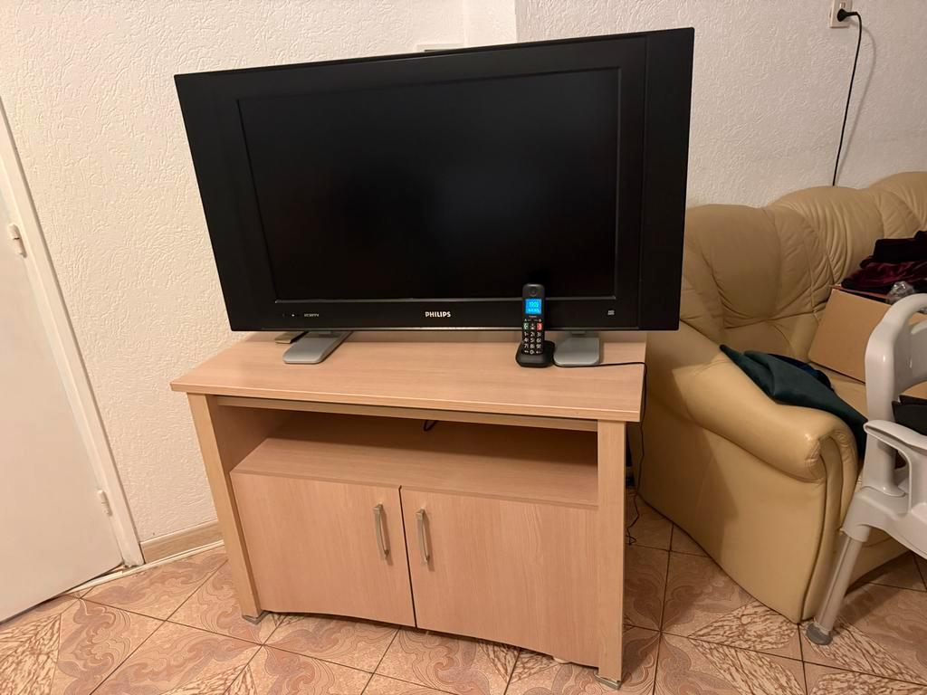 Diverse meubels beschikbaar, waaronder een vitrinekast met glazen deuren, een tv-meubel met opbergruimte en een dressoir met spieg