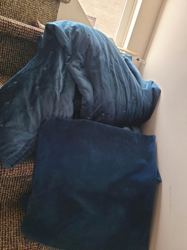 Gratis af te halen 6 45x45 kussen hoezen, is donkerblauw, ziet eruit als satijn . Zit ook een 2mx2m blauwe deken bij. Ook gratis a