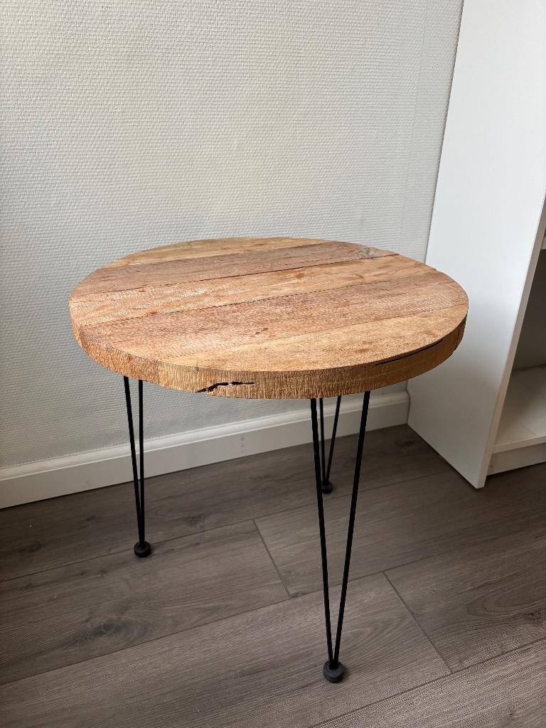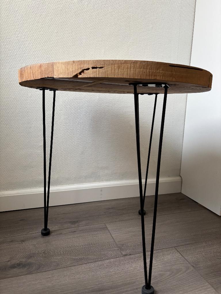 Leuk bijzettafeltje met metalen pootjes. Diameter 50 cm, hoogte 50 cm.