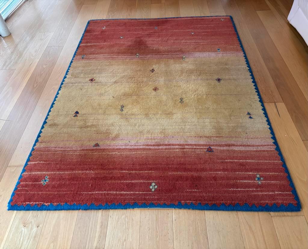 Een mooi, rechthoekig vloerkleed met een uniek patroon. Het kleed is in goede staat en kan een warme sfeer toevoegen aan elke kame