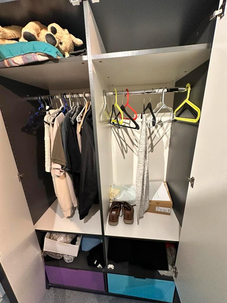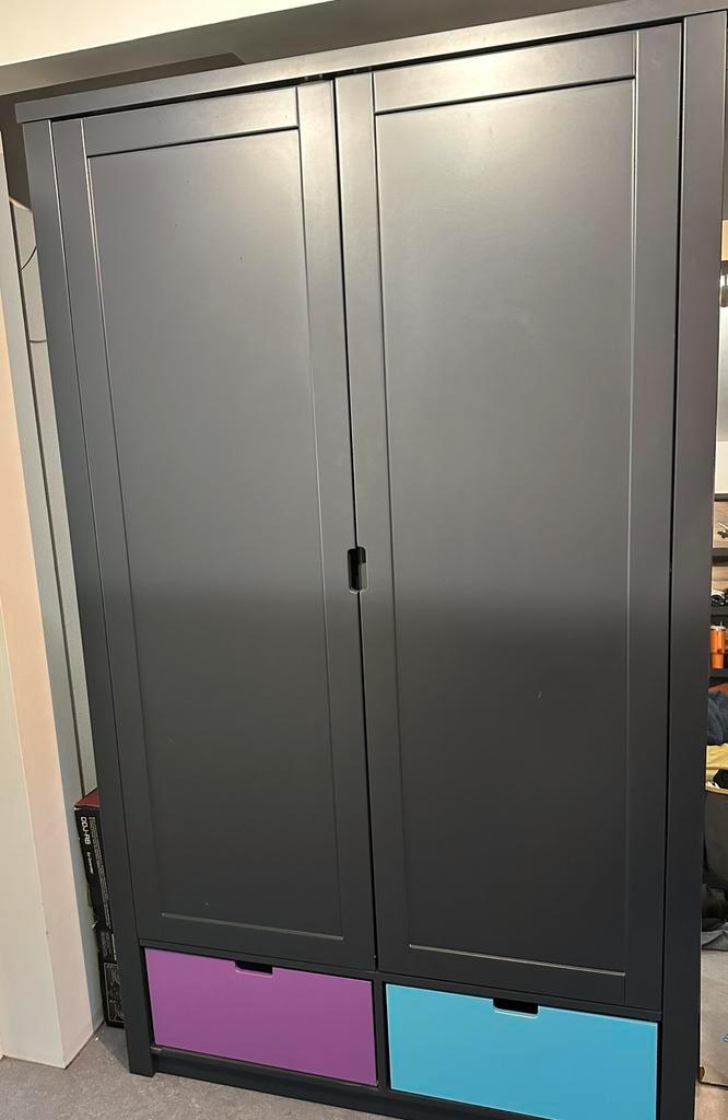 Prachtige kledingkast. Donkergrijs met 2 kleurrijke lades. 120X60x201 cm. Al gedemonteerd. Ophalen zsm oldenzaal.
