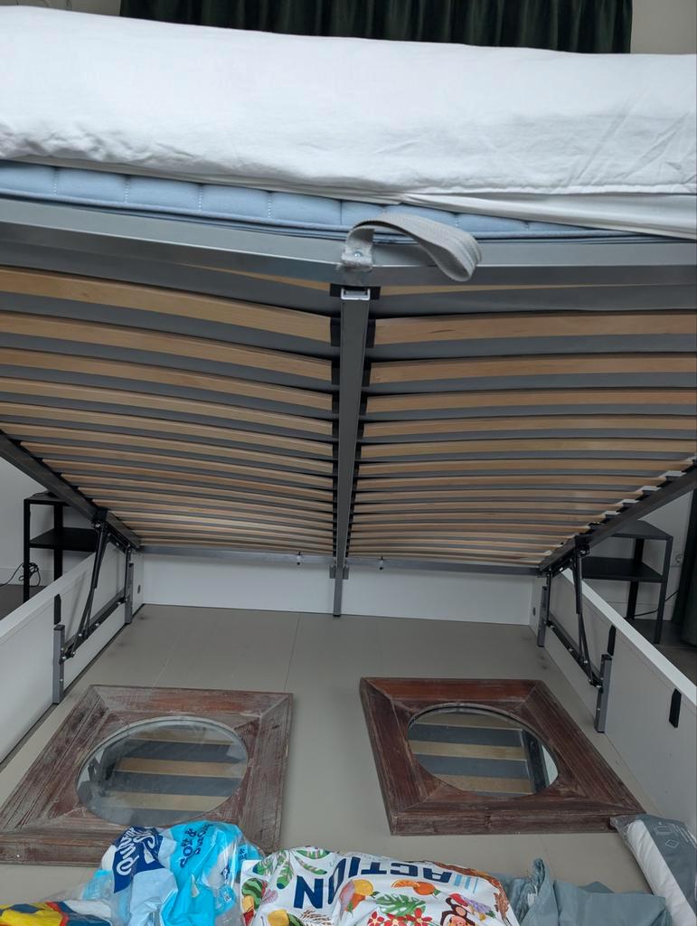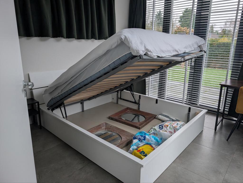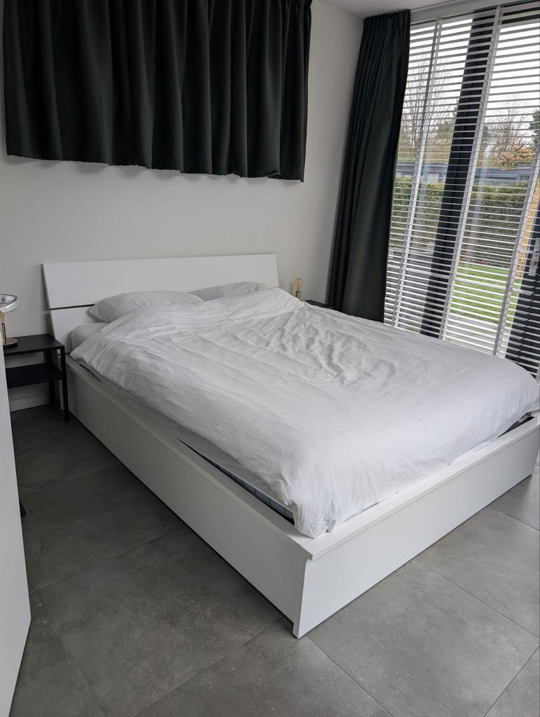 Gebruikt tweepersoonsbed (160 x 200 cm) inclusief matras. Het bed is wit en heeft een handige opbergruimte onder de lattenbodem, d
