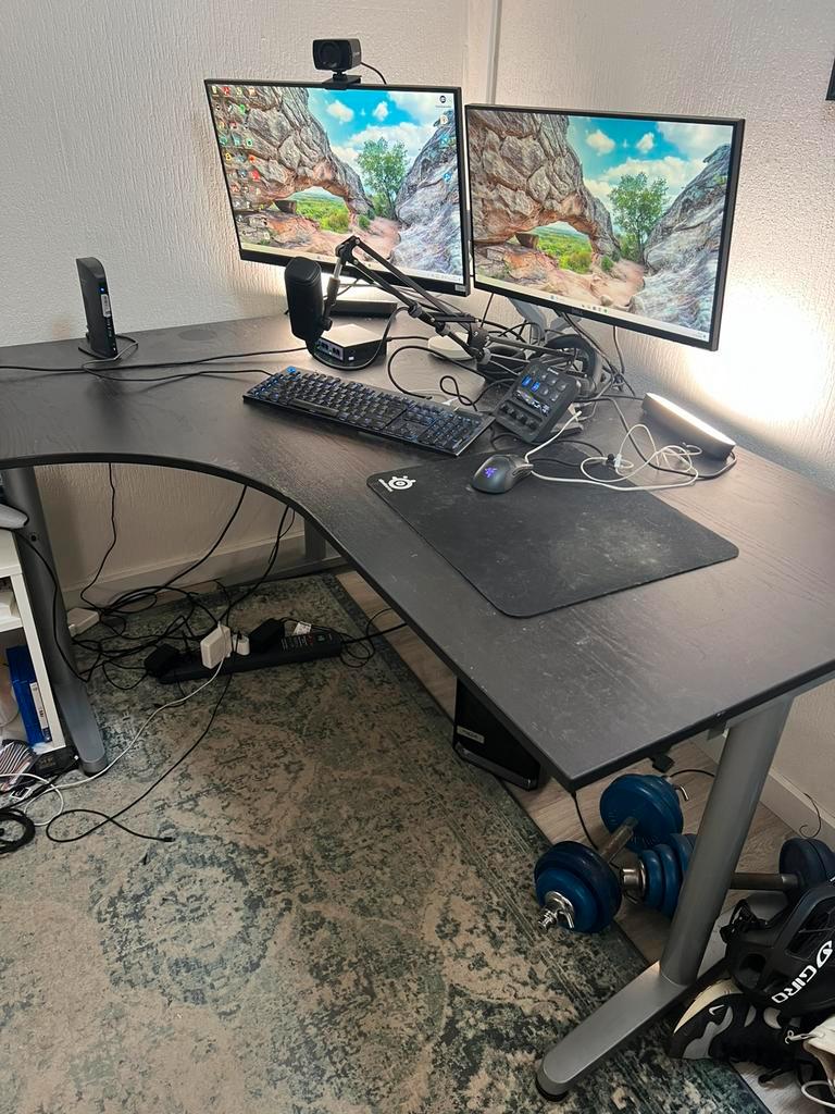 Hoekbureau die in hoogte ook verstelbaar is. Nog in goede staat. 160X120. Eventueel met ikea kabelgoot (signum). Bureau is al gede