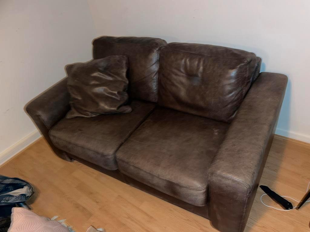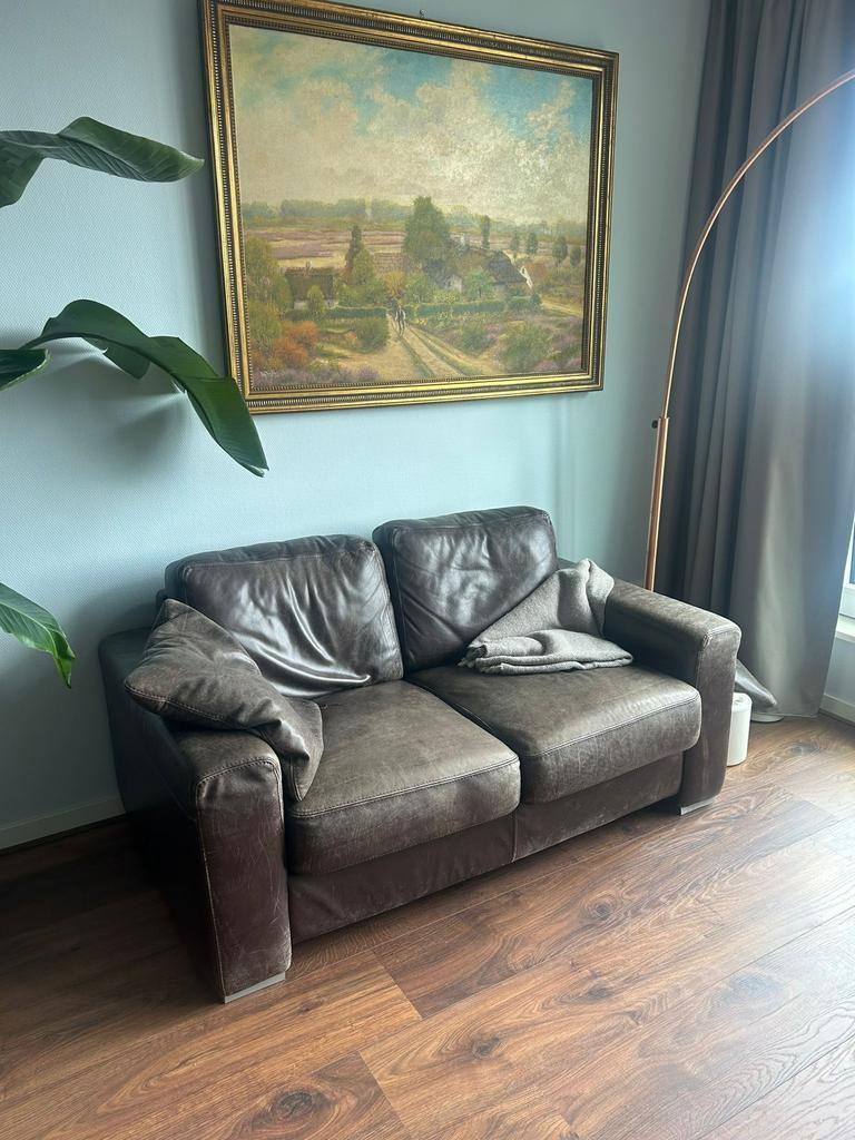 Mooie bruine leren tweezitsbank. De bank is in gebruikte staat, maar nog prima te gebruiken. Ideaal voor een kleine woonkamer of s