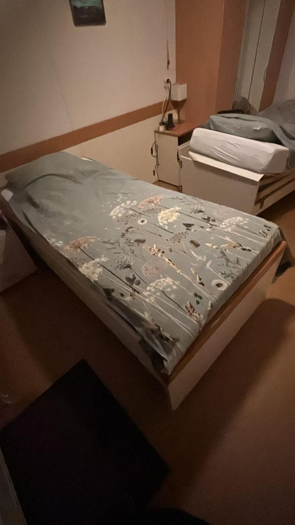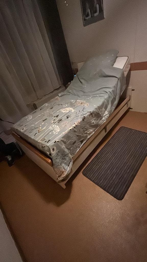 Seniorenbed met elektrische bedbodem met achterbord en eventueel matras. Let op. Het is de helft van een set. Dit houdt in dat de