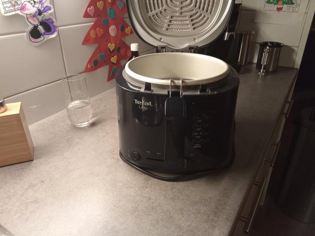 Schone pan een scharnierpunt is stuk maar deksel werkt en sluit prima. Ik verkoop dit omdat toch met air freyer verder ga.