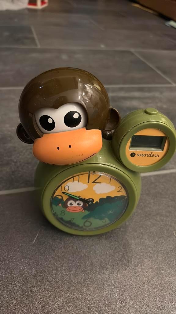 Handig voor kleine kinderen. Tijd is instelbaar en dan gaan de ogen van de aap open. Werkt op batterijen