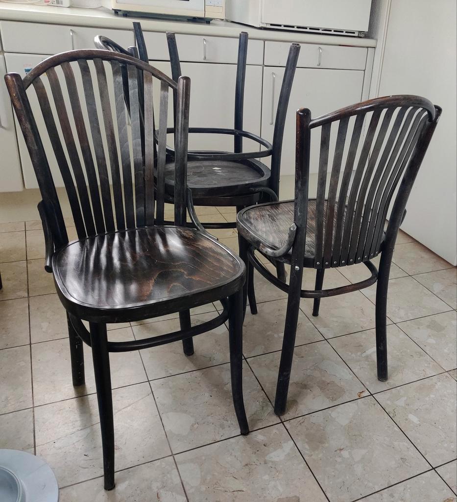 Gratis af te halen: vier houten eetkamerstoelen. Hebben zichtbare gebruikssporen (zoals verbleekte/beschadigde lak), maar structur
