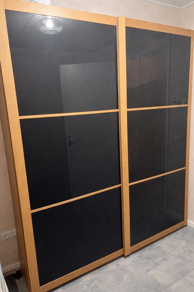 Mooie en stevige schuifkast met een houten frame en stijlvolle donker getinte glazen schuifdeuren. Het strakke en moderne design p