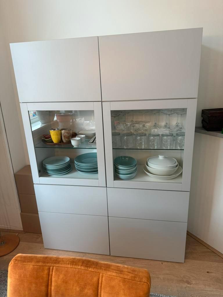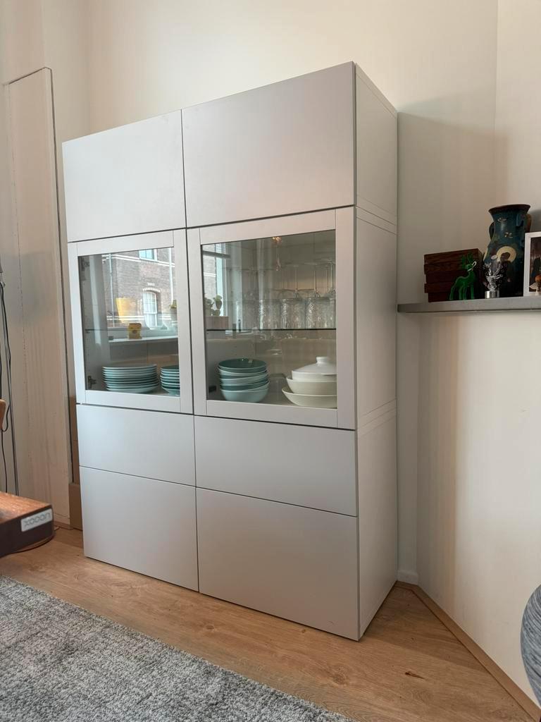 Mooie grote kast met glazen deuren. Afmeting 168 x 120 x 42. Zachtgrijze kleur. Bovendeel met een houten plank en deurtjes middend