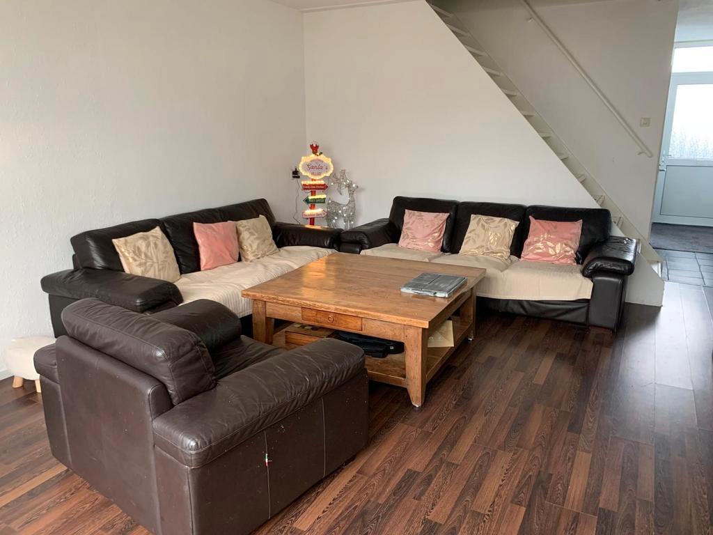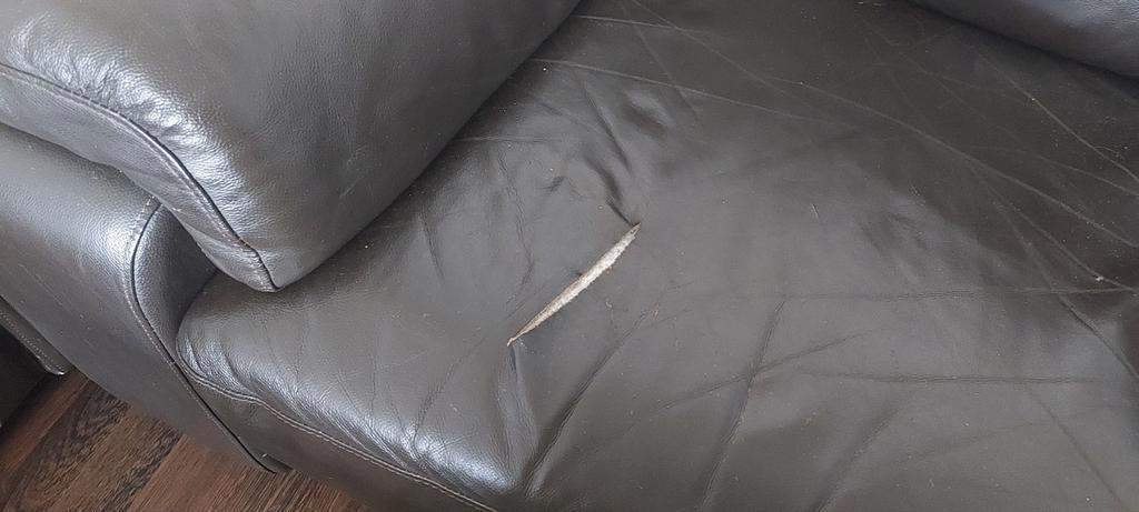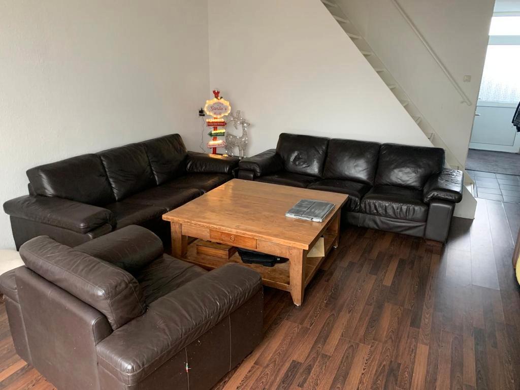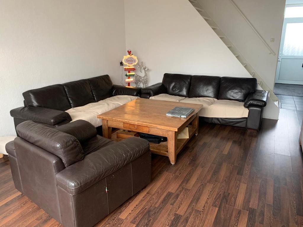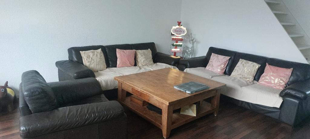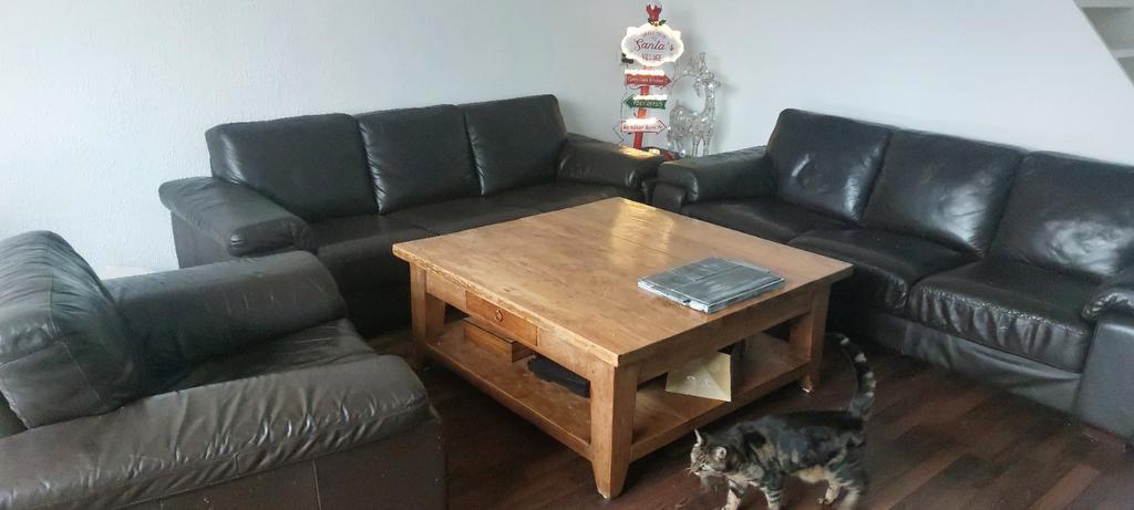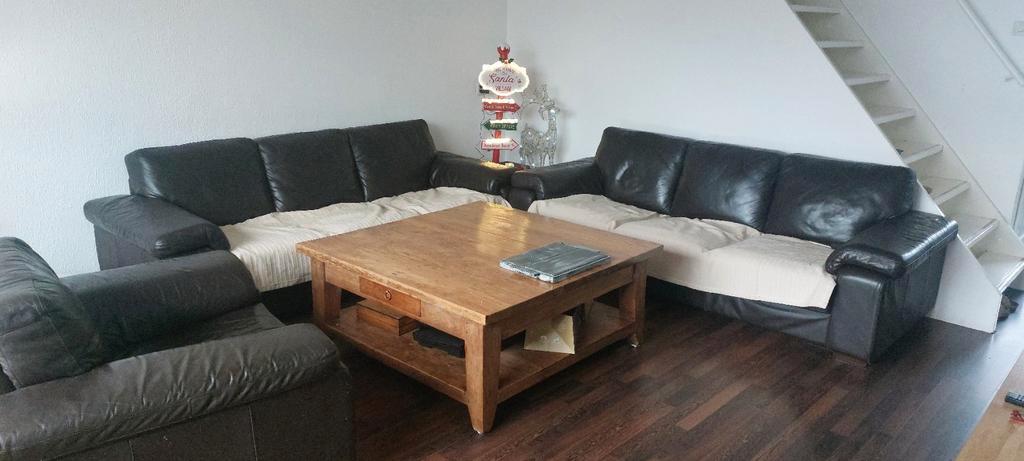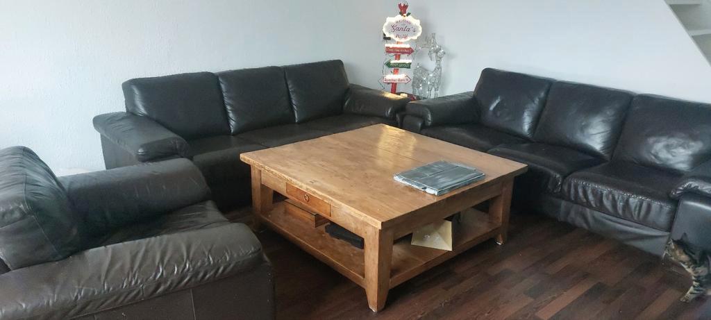 Mooie zitbank van leer, bestaande uit een hoekbank, een driezitsbank en een losse fauteuil. De bank is gebruikt, maar in goede sta