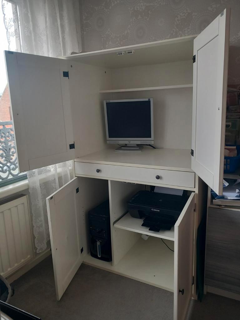 Computerkast in gebruikte staat. Deurtjes hebben beide beschadiging zie foto. Verder in goede en stevige staat kastje. Afmeting h