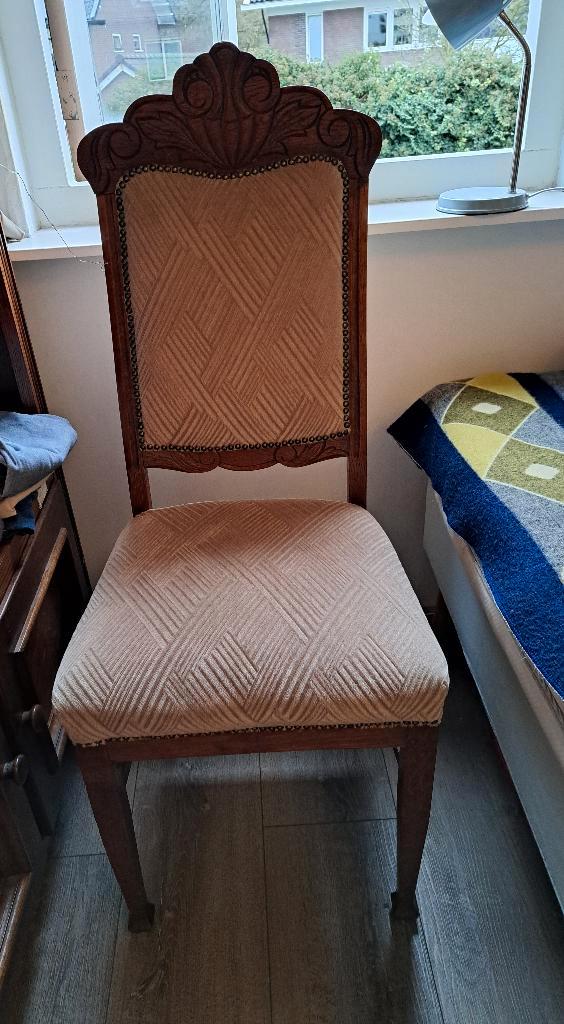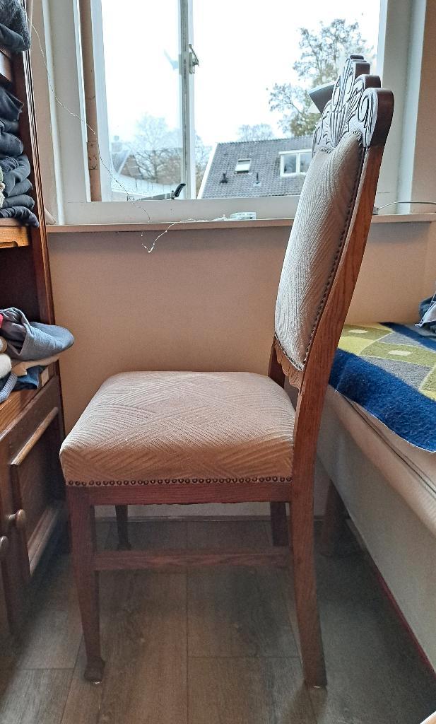 Mooie, stevige houten stoel met handgesneden vormen in de leuning. De kussens zijn gestoffeerd met een zachte beige stof. Gratis o