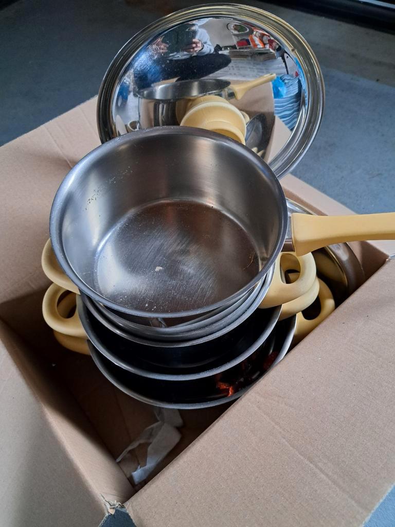 Een gebruikte pannenset, bestaande uit verschillende pannen en een deksels en steelpan. De pannen zijn van verschillende materiale