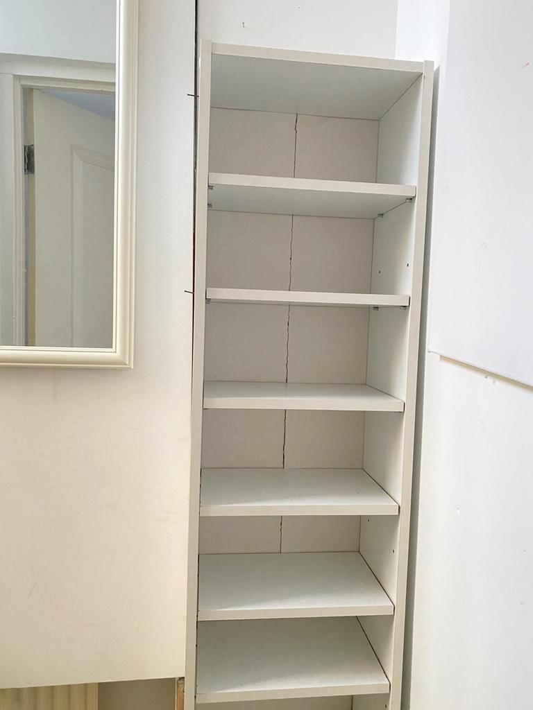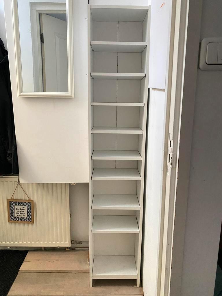 Smal wit kastje. Handig voor boeken en cd’s in kleine ruimte. Achterkant wat beschadigd maar valt niet op met spullen ervoor. Vand