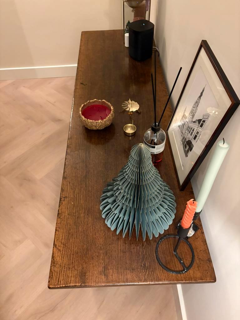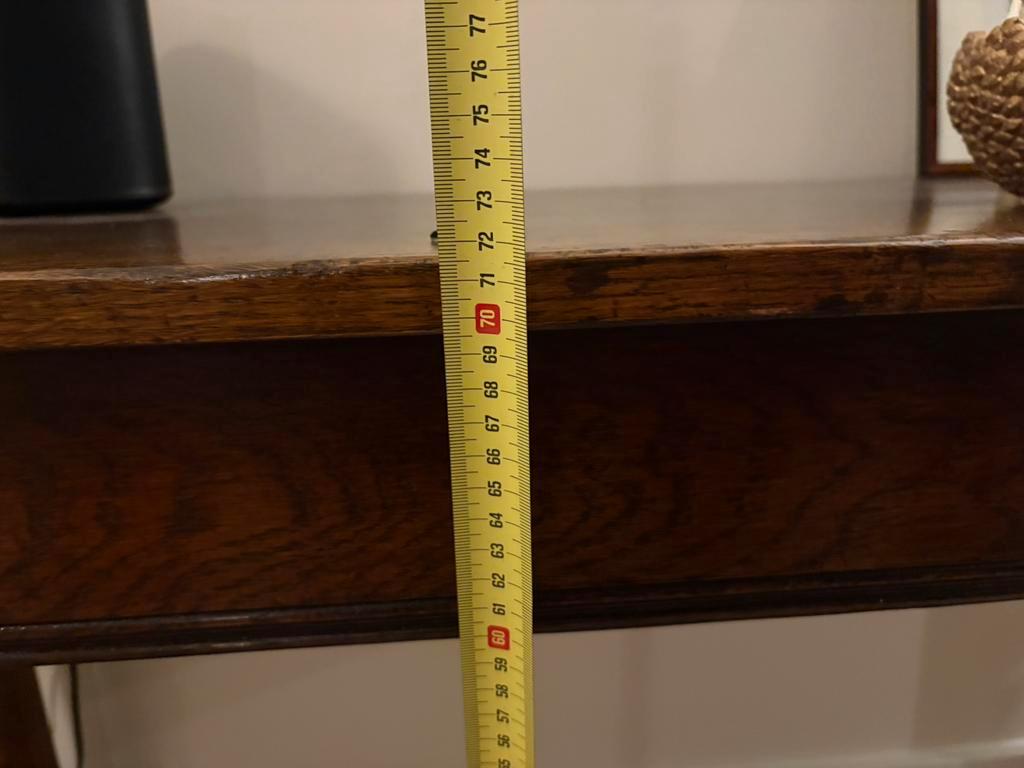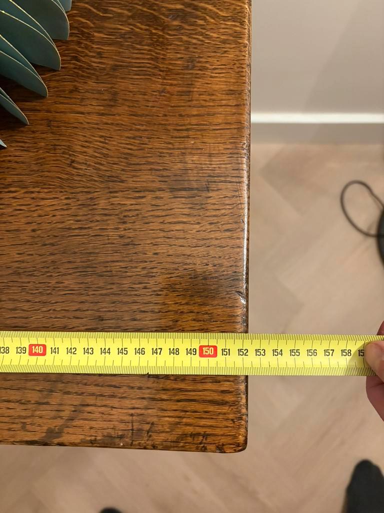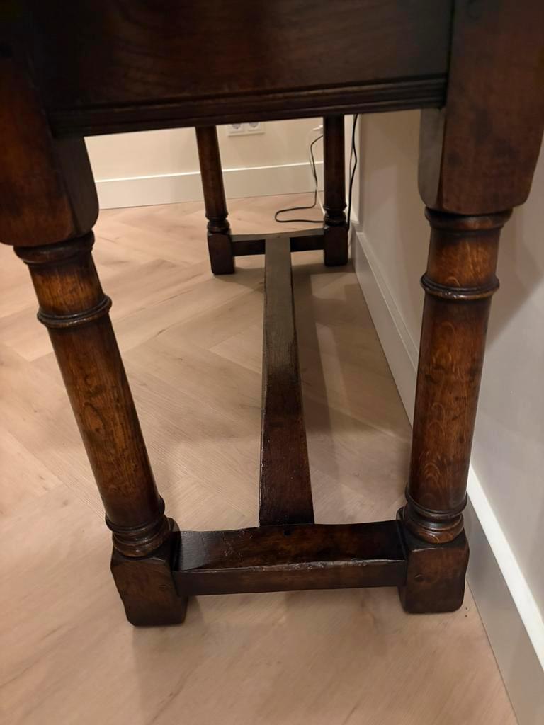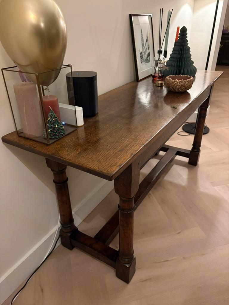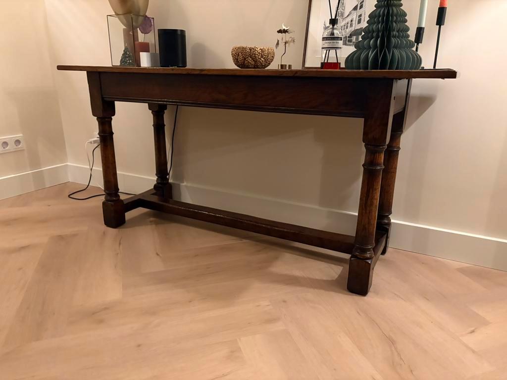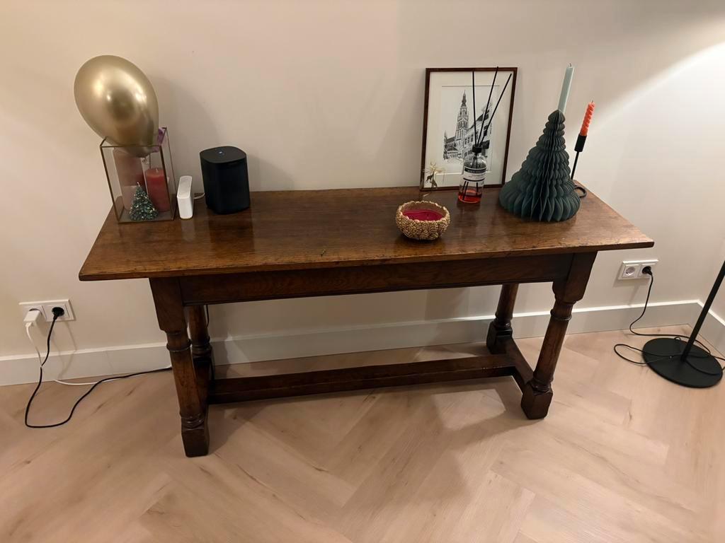 Antieke side table van hout. Wordt niet meer gebruikt ivm een vakkenkast afmetingen zijn; lengte 152cm breedte 45,5cm hoogte 71,5c
