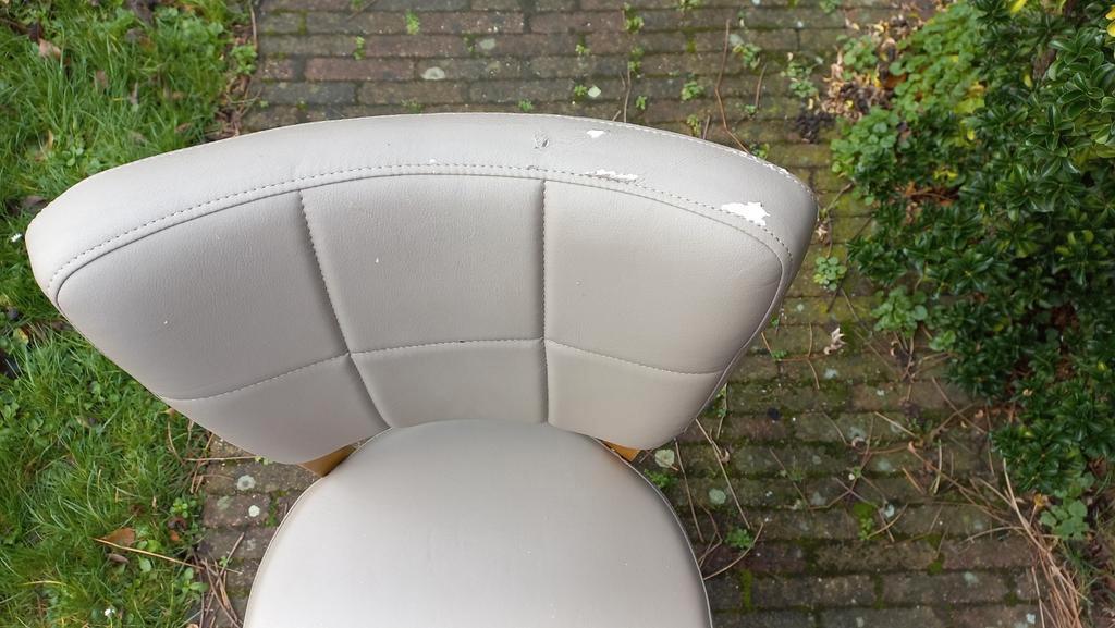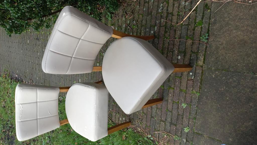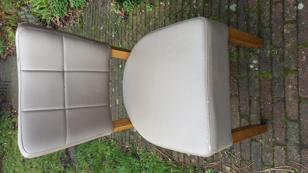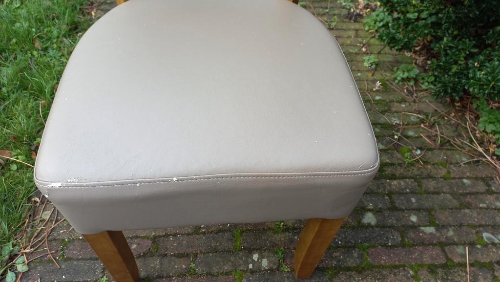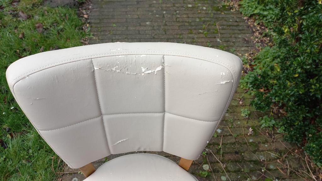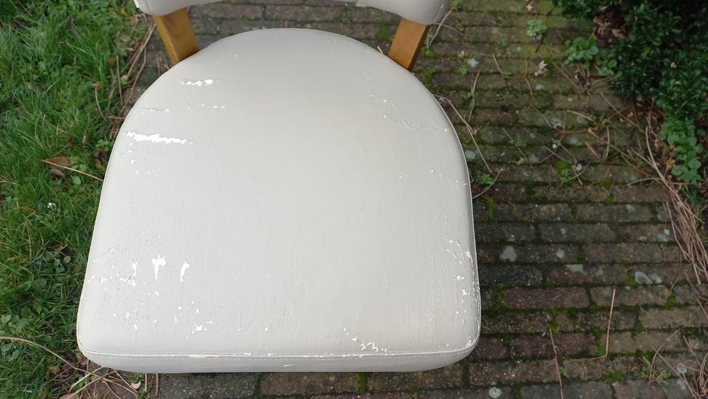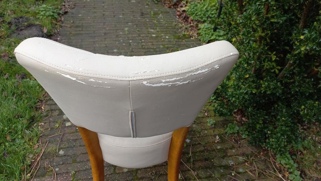 Bekleding beschadigd door 2 kittens. Met een (stretch)stoelhoes erover nog bruikbaar. Inmiddels zelf nieuwe eetkamerstoelen.