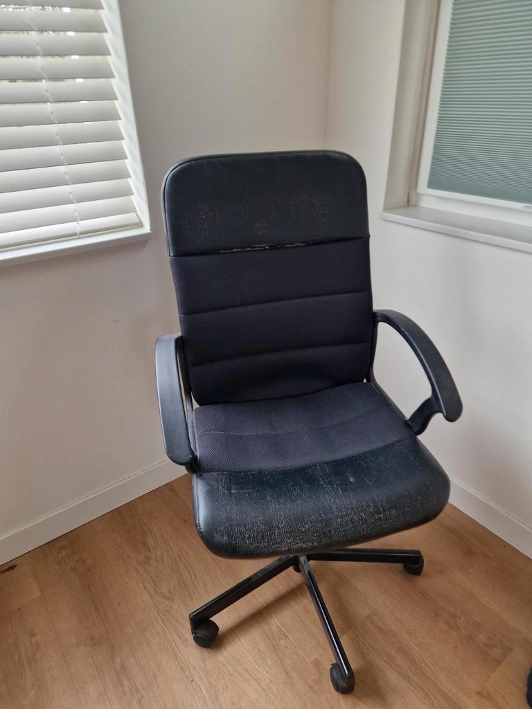 Gebruikte zwarte bureaustoel. De stoel is nog functioneel, maar vertoont gebruikssporen. Ideaal voor studenten of als extra stoel