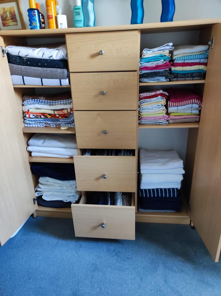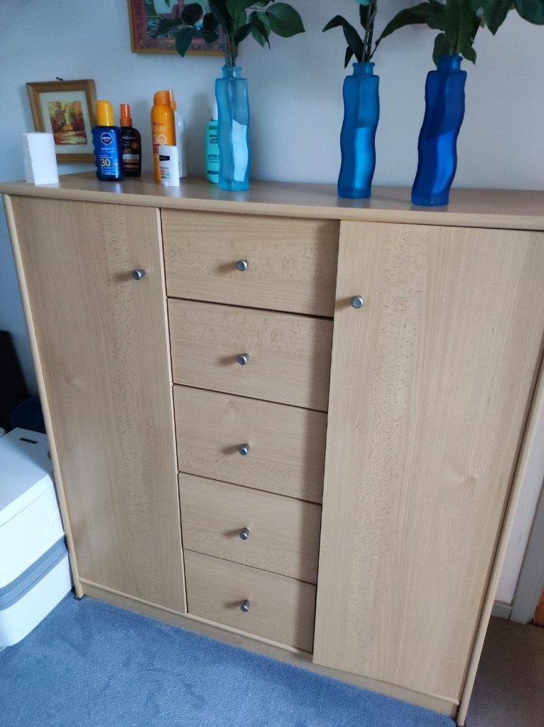 Vrijdag of zaterdag gratis af te halen: linnenkast hout met 2 deurtjes en 5 lades. De afmetingen zijn 105,5 cm breed, 113 cm hoog