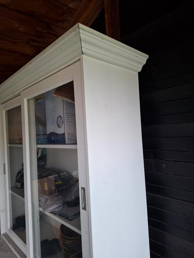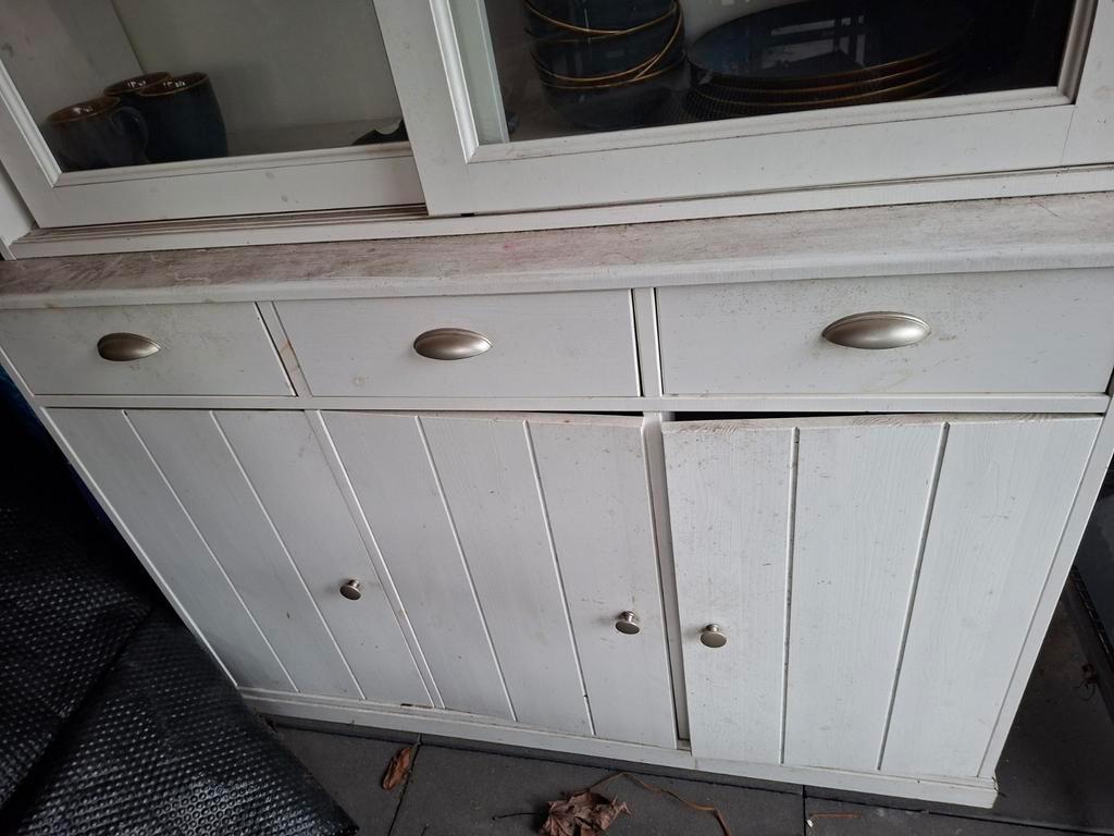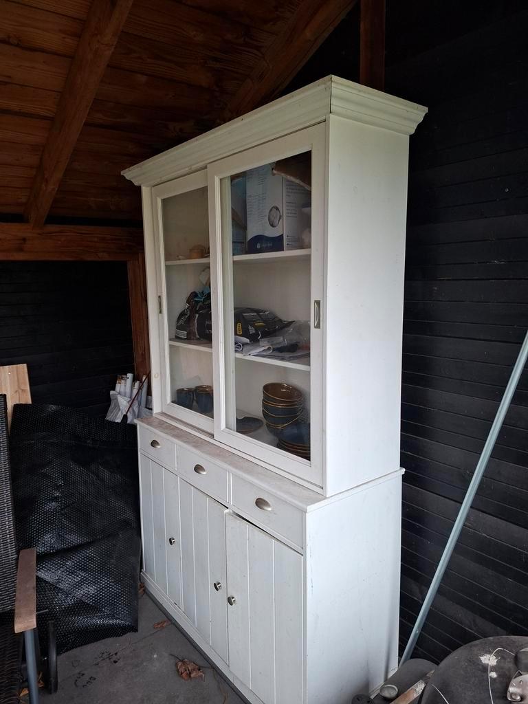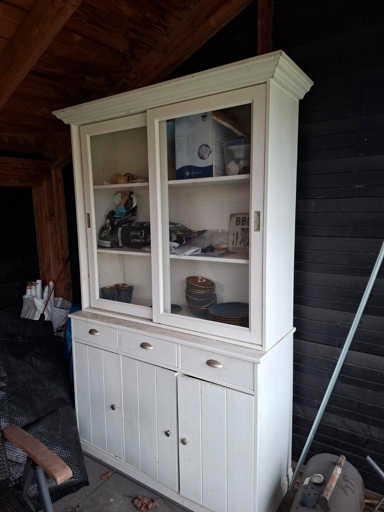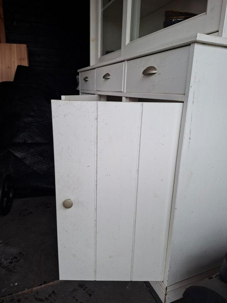 Gebruikte witte servieskast in goede staat. Het glas is nog heel. De kast kan een likje verf gebruiken. Gratis af te halen.