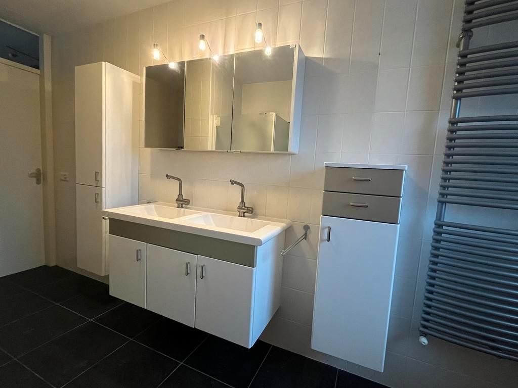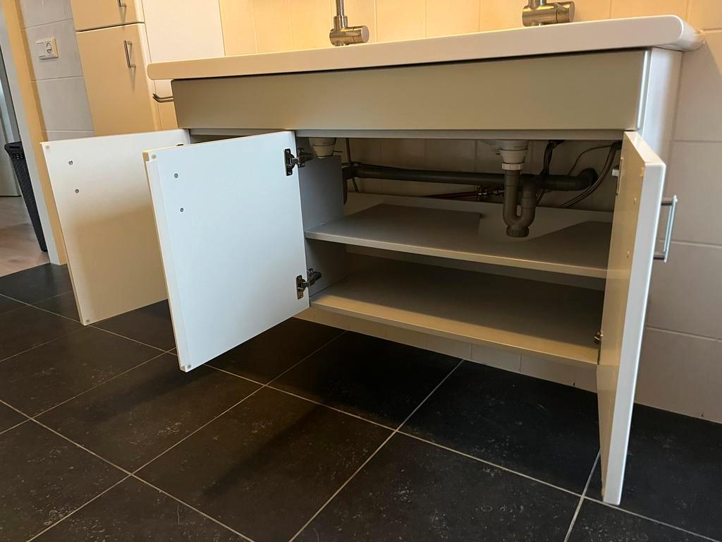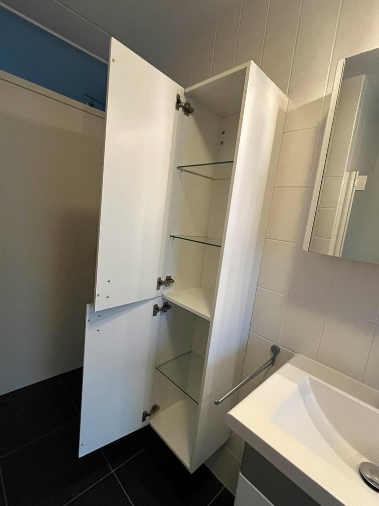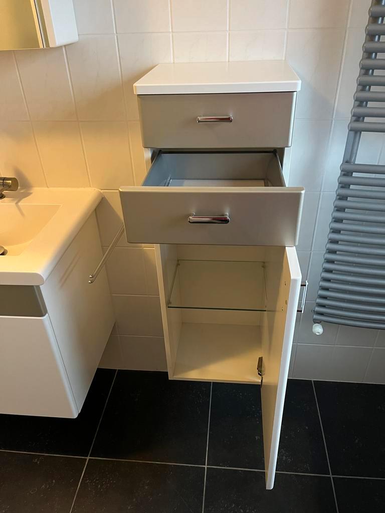 Complete badkamer meubel set bestaande uit een hoge kast, wasbak, wasbakkast, spiegelkast en een kleine kast met lades. De set is