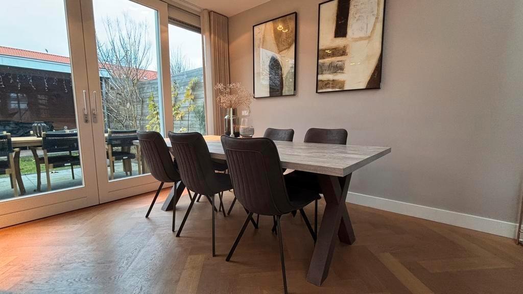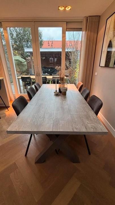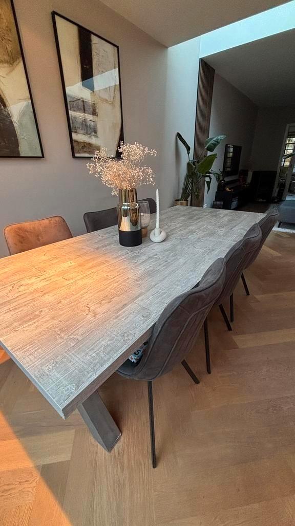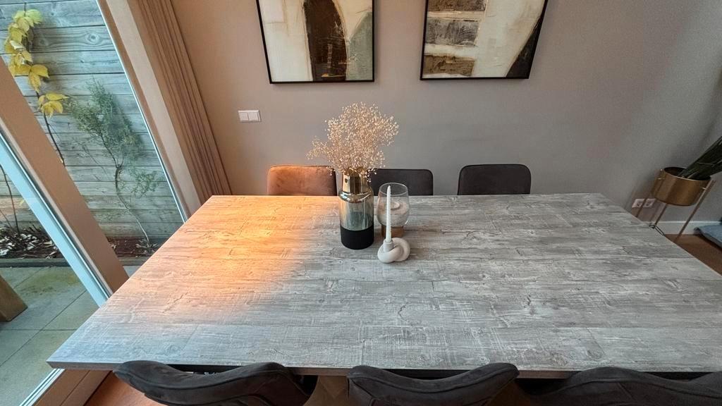 Mooie grijze eettafel van 220x100cm. Incl. 4 Stoelen. Wij hebben een nieuwe eethoek gekocht, dus kan deze weg. Tafel heeft wat kle