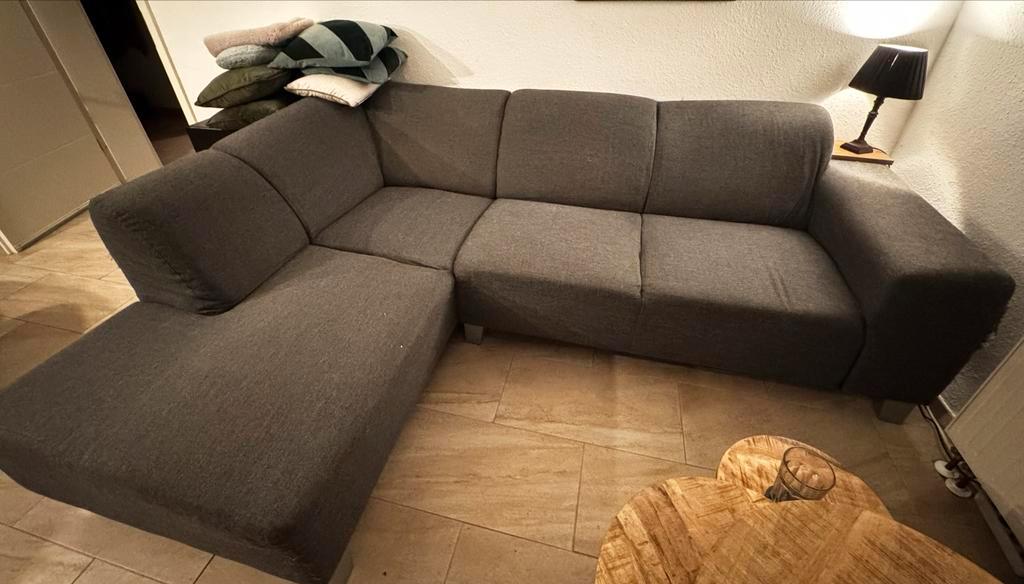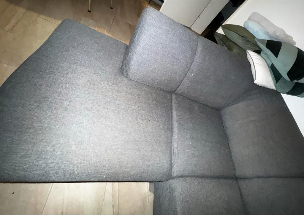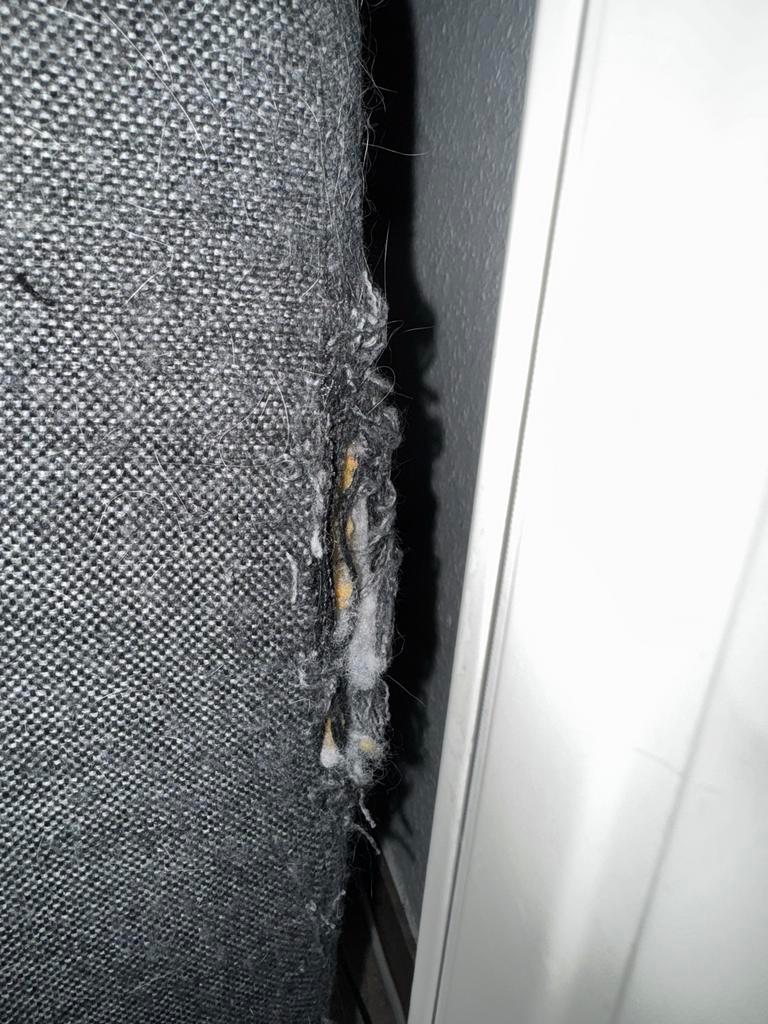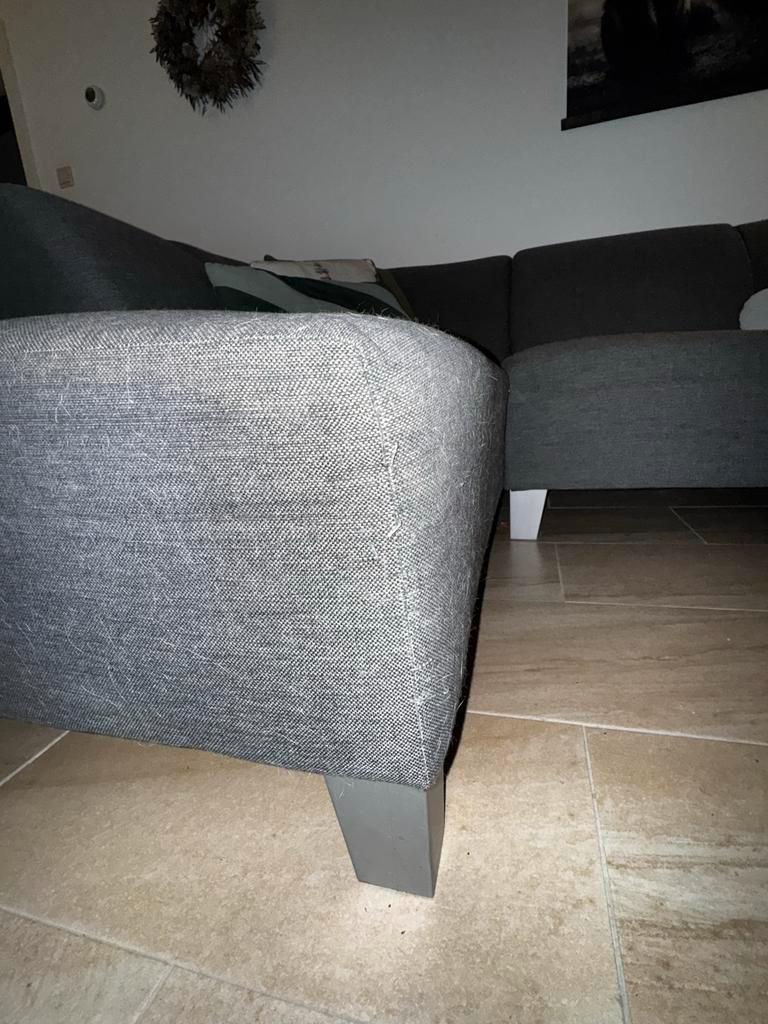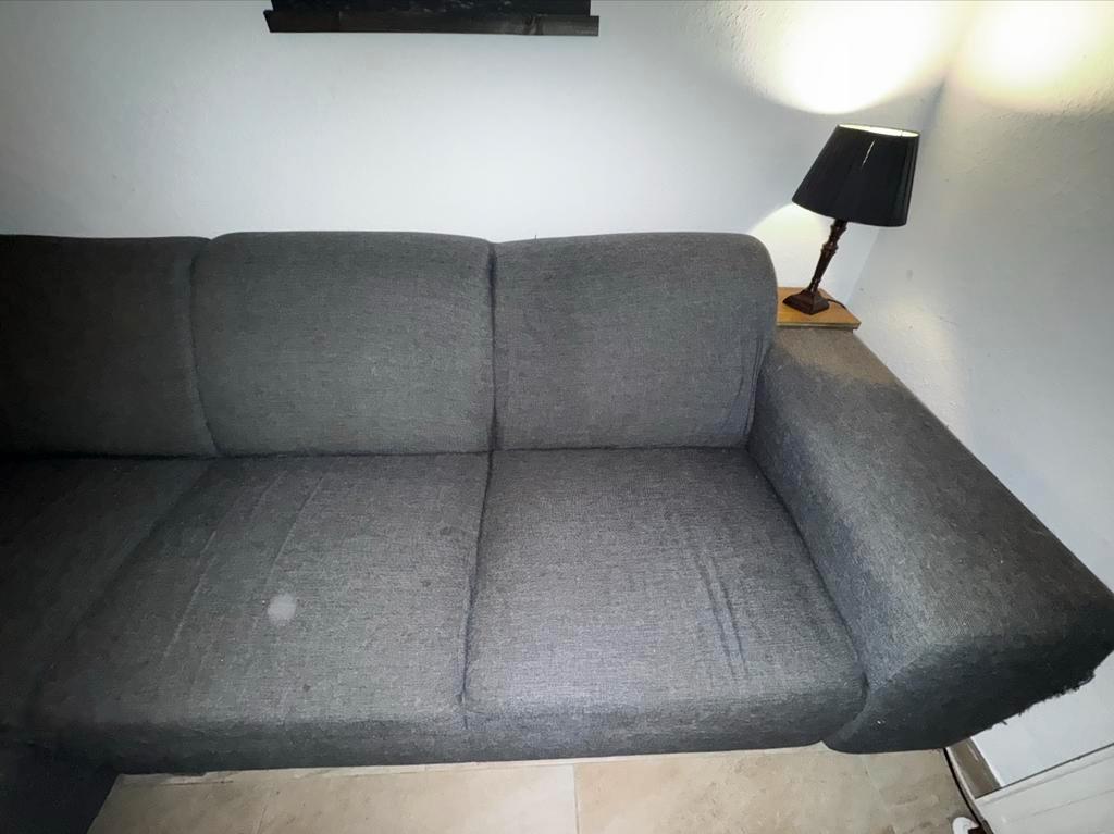 De bank heeft gebruikerssporen en is gebruikt in een huis met huisdieren. Er is een beschadiging aan de hoek en er zijn enkele vle