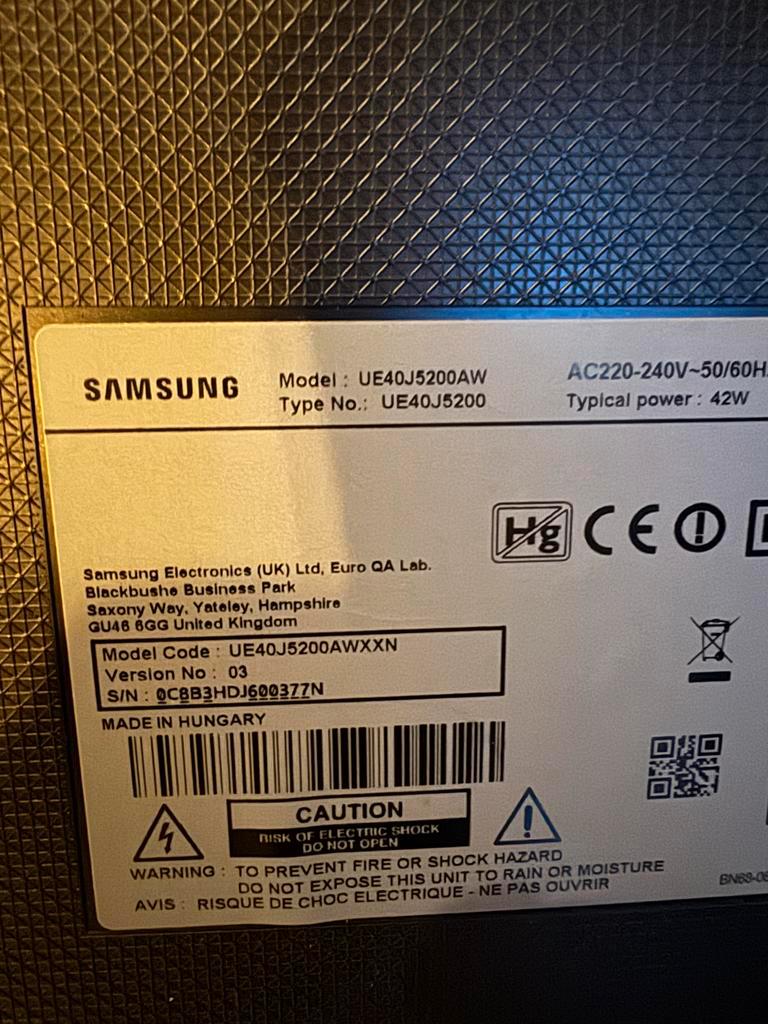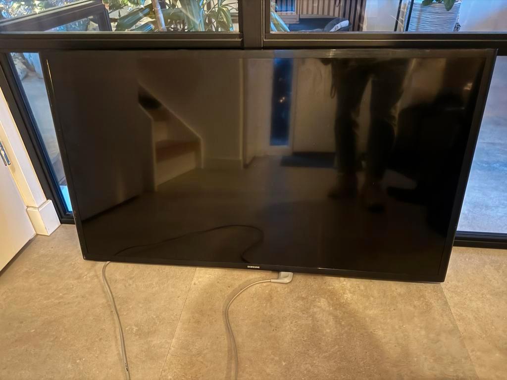 Samsung 40 inch televisie. Gaat wel aan, maar het scherm blijft zwart. Wordt verkocht zonder voet. Model: ue40j5200awxxn. Wellicht