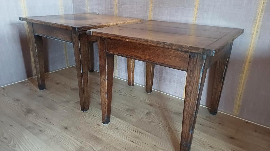 Set van twee vintage houten bijzettafels. De tafels zijn gebruikt en hebben een rustieke uitstraling. Ideaal als decoratie of func