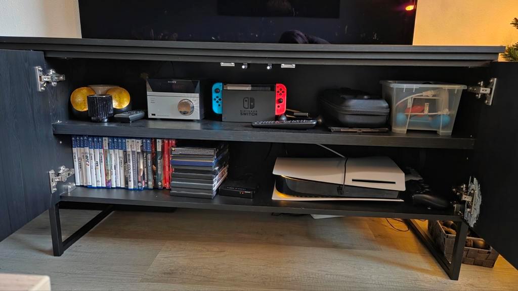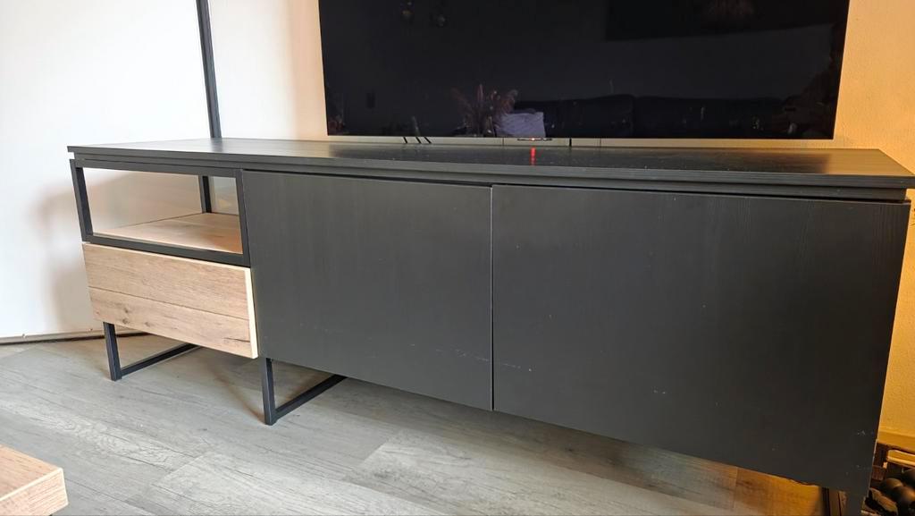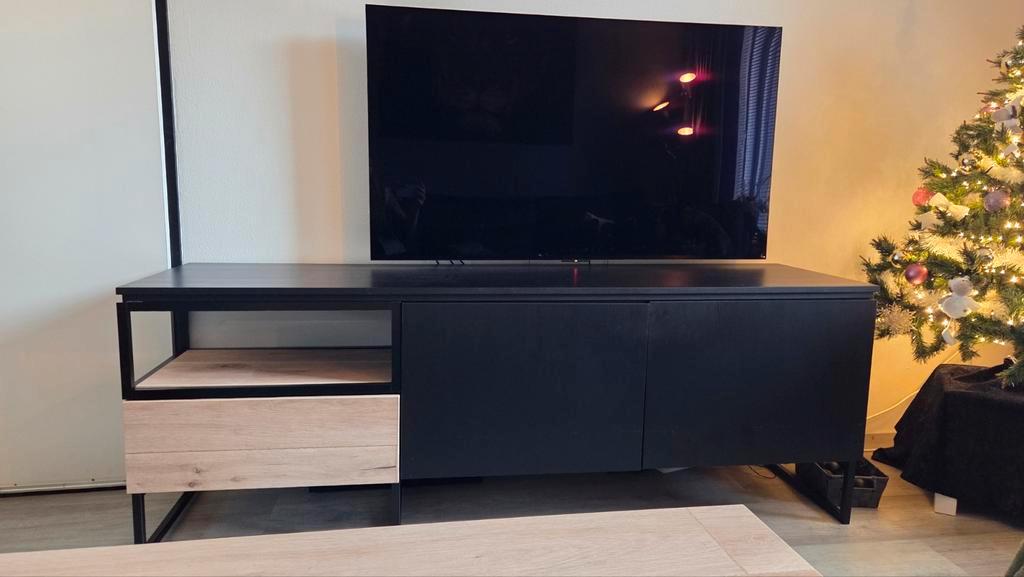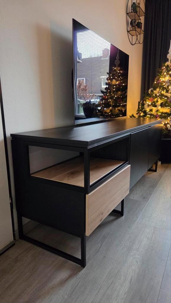 Stijlvolle tv-meubel kast met een moderne uitstraling. De kast verkeerd in gebruikte staat, maar ziet er nog keurig uit en klaar v