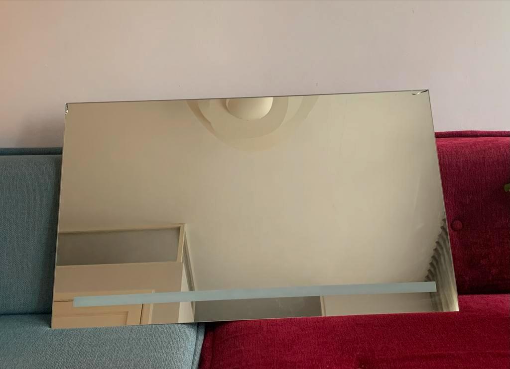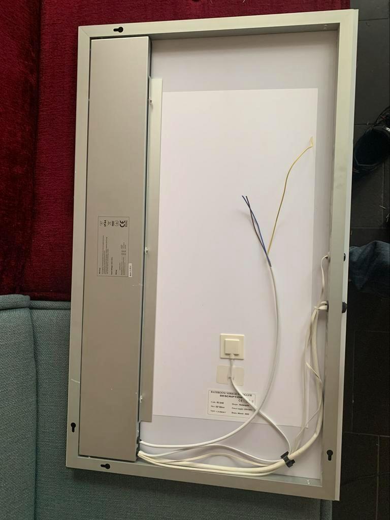Gratis badkamerspiegel met ingebouwde infrarood verwarming en verlichting. De spiegel heeft kleine beschadigingen in de bovenhoeke