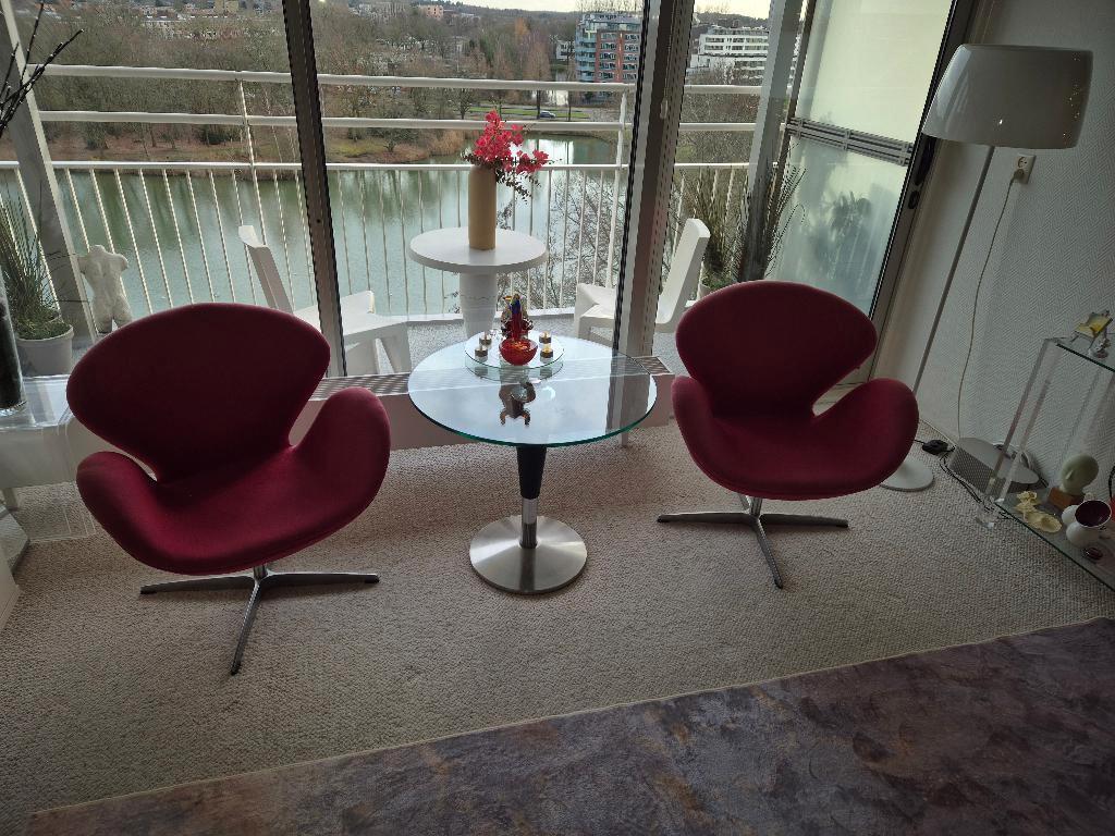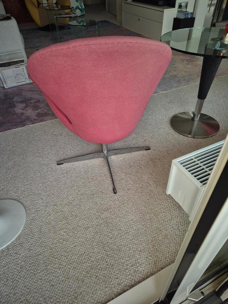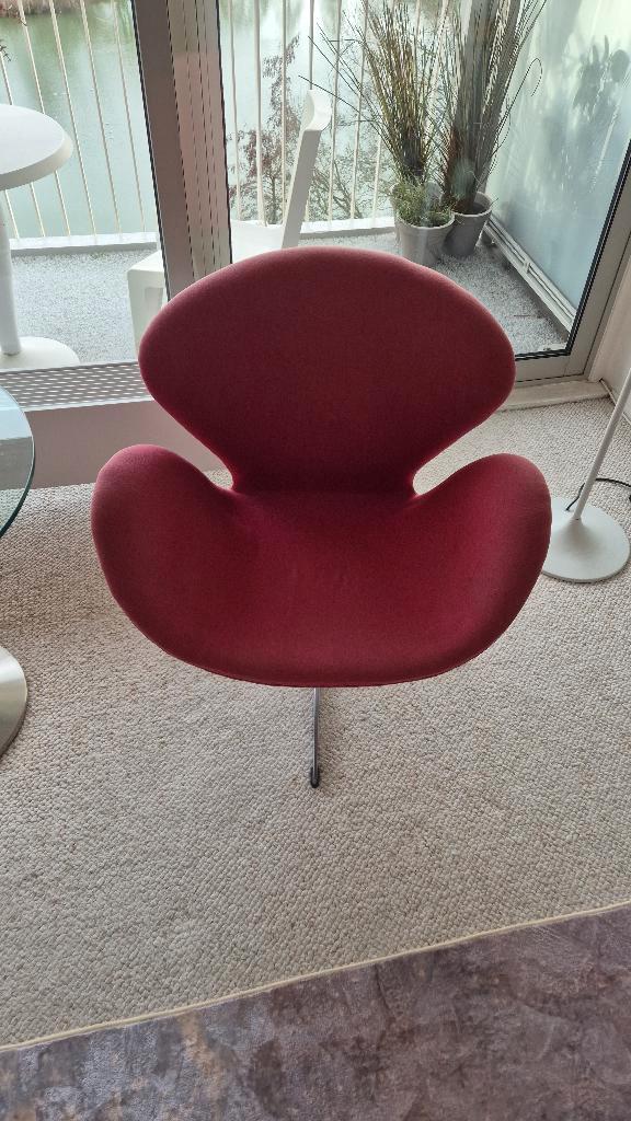 Wij hebben twee stoeltjes over al la swan. Ze zijn bekleed met rode stof en deze is door de zon verschoten, vooral op de achterkan