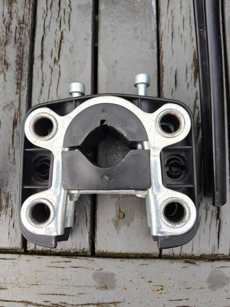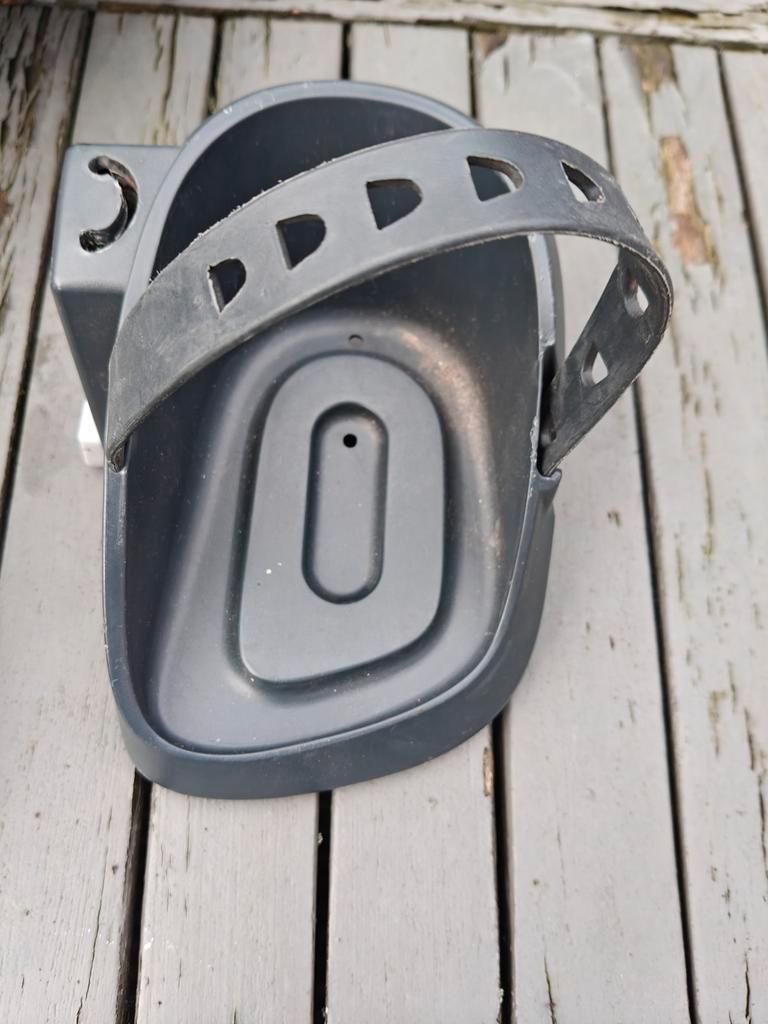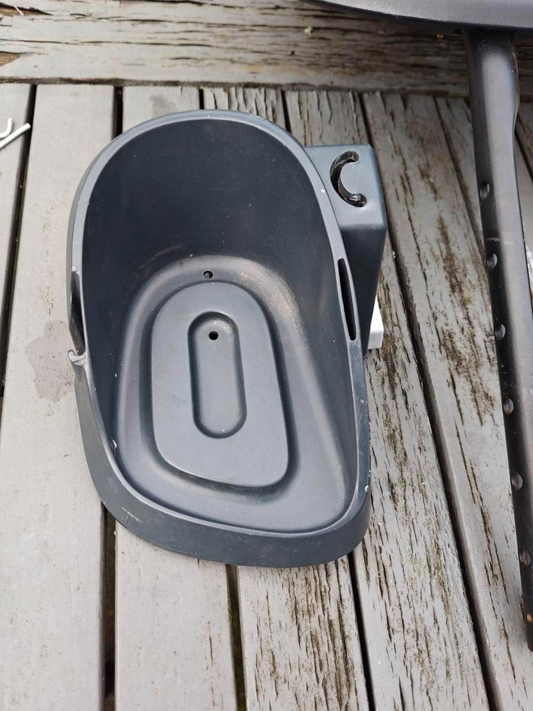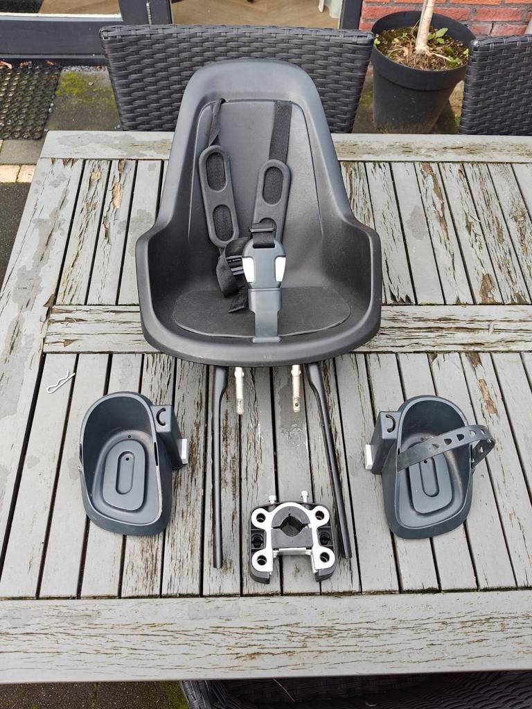 Bobike voorzitje voor op de fiets. Het zitje is in prima staat, maar er ontbreekt een van de bandjes voor de voeten. Verder is het