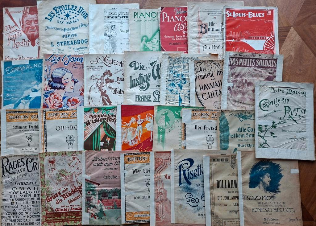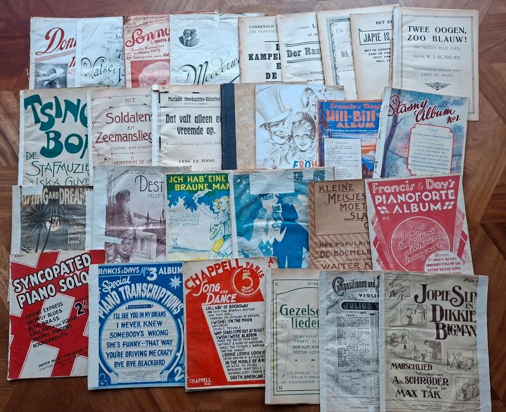Garagevondst! Koffer met een verzameling vintage bladmuziek. Ca. 50 Stuks, ook verzamelboekjes. Diverse genres. Ca. 75-100 Jaar ou