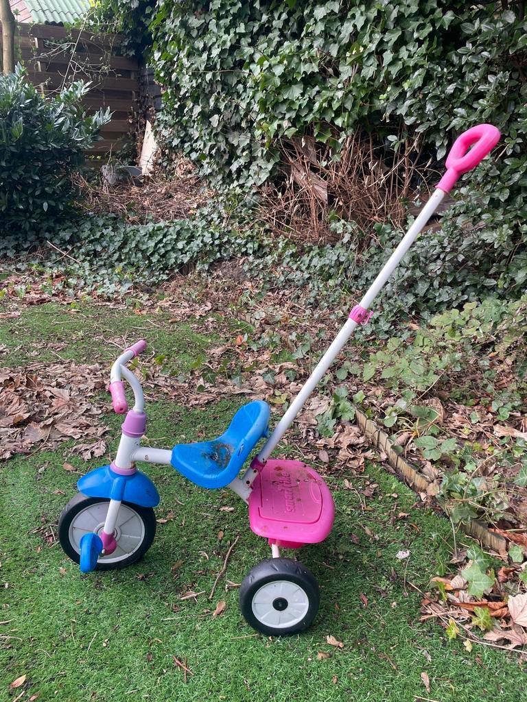 Roze driewieler met kofferbakje en afstelbare duw stok. Gebruikt en schoonmaakbeurtje nodig maar prima voor tweede ronde.
