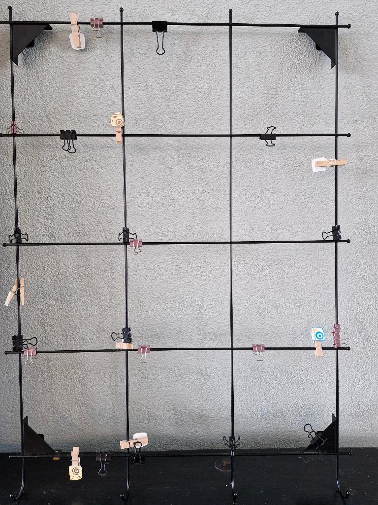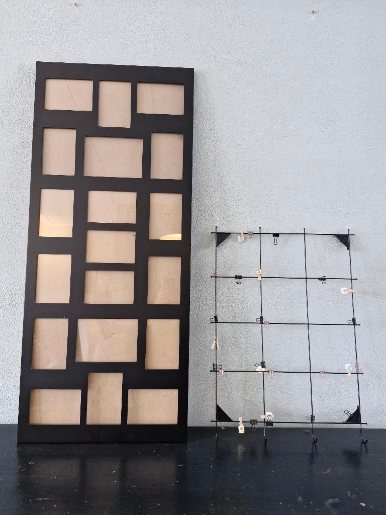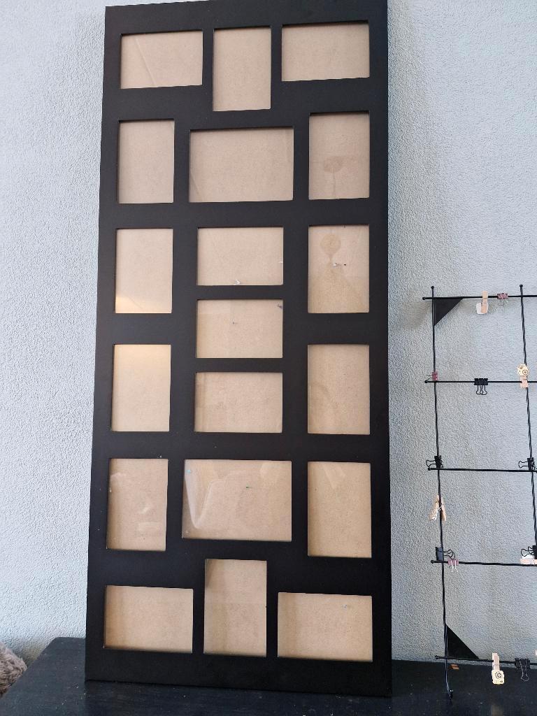Grote fotolijst voor 19 fotootjes. Horizontaal en verticaal op te hangen. En leuk foto/kaartenrekje met knijpertjes gebrikt maar nog in nette staat