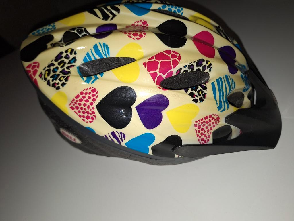 Leuke kinderfietshelm met vrolijke print, merk bell geschikt voor jongens en meisjes. In goede staat. Maat zie foto.