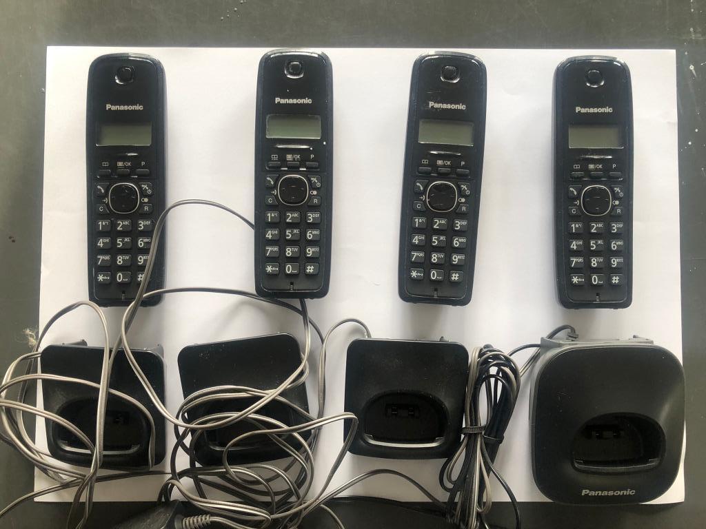 Set van 4 draadloze telefoons: 1 homestation met draadloze telefoon 3 draadloze telefoons met elk aparte opladers prima conditie exclusief verzendkost
