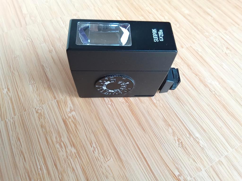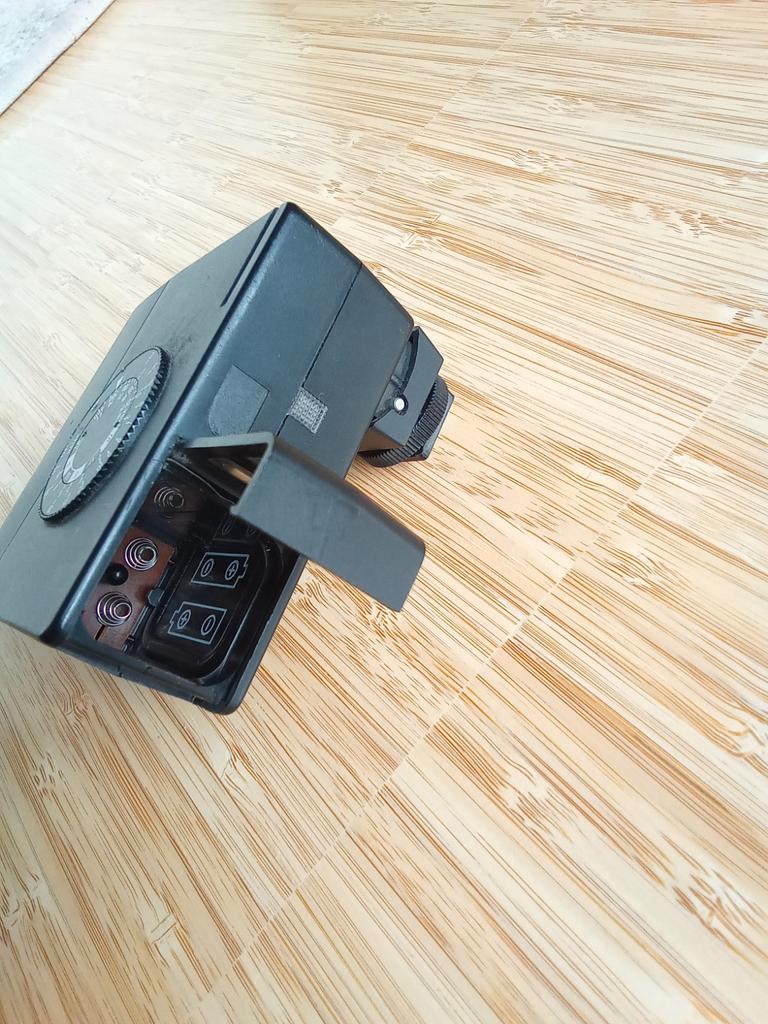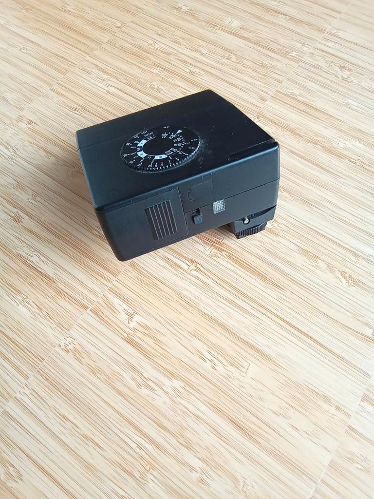Standaard sunpak flitser. Werkt op 4 aa batterijen, tweezijdig kantelbaar op de voet. Niet getest.