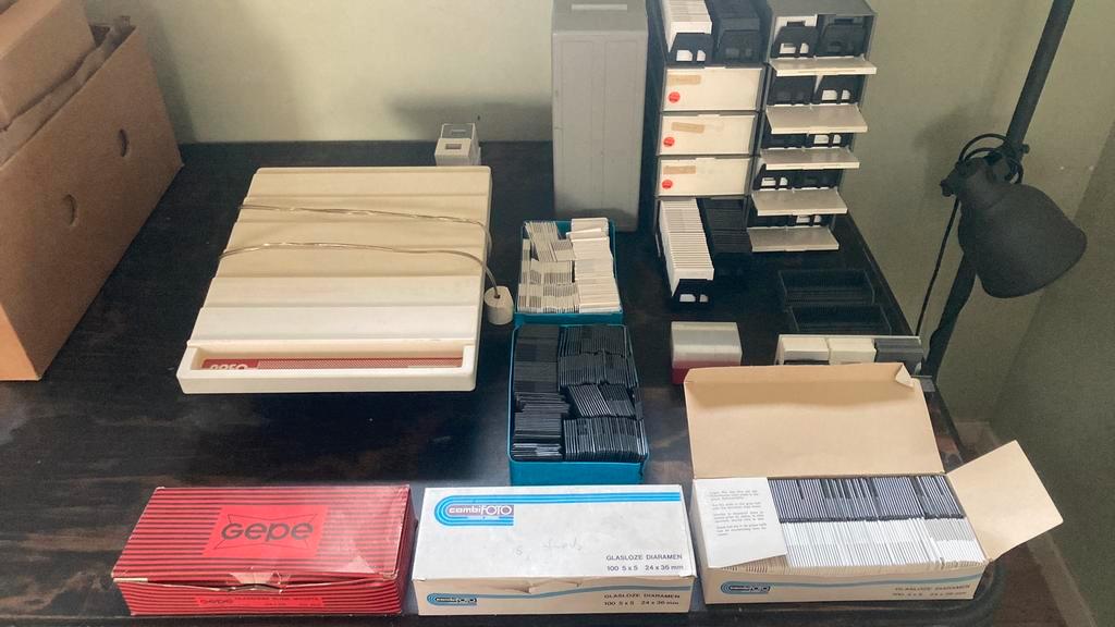 Veel ramen vooral 5x5, 24x36mm cassettes opbergdozen verlichte sorteertafel zie de foto, graag alles in 1 keer.